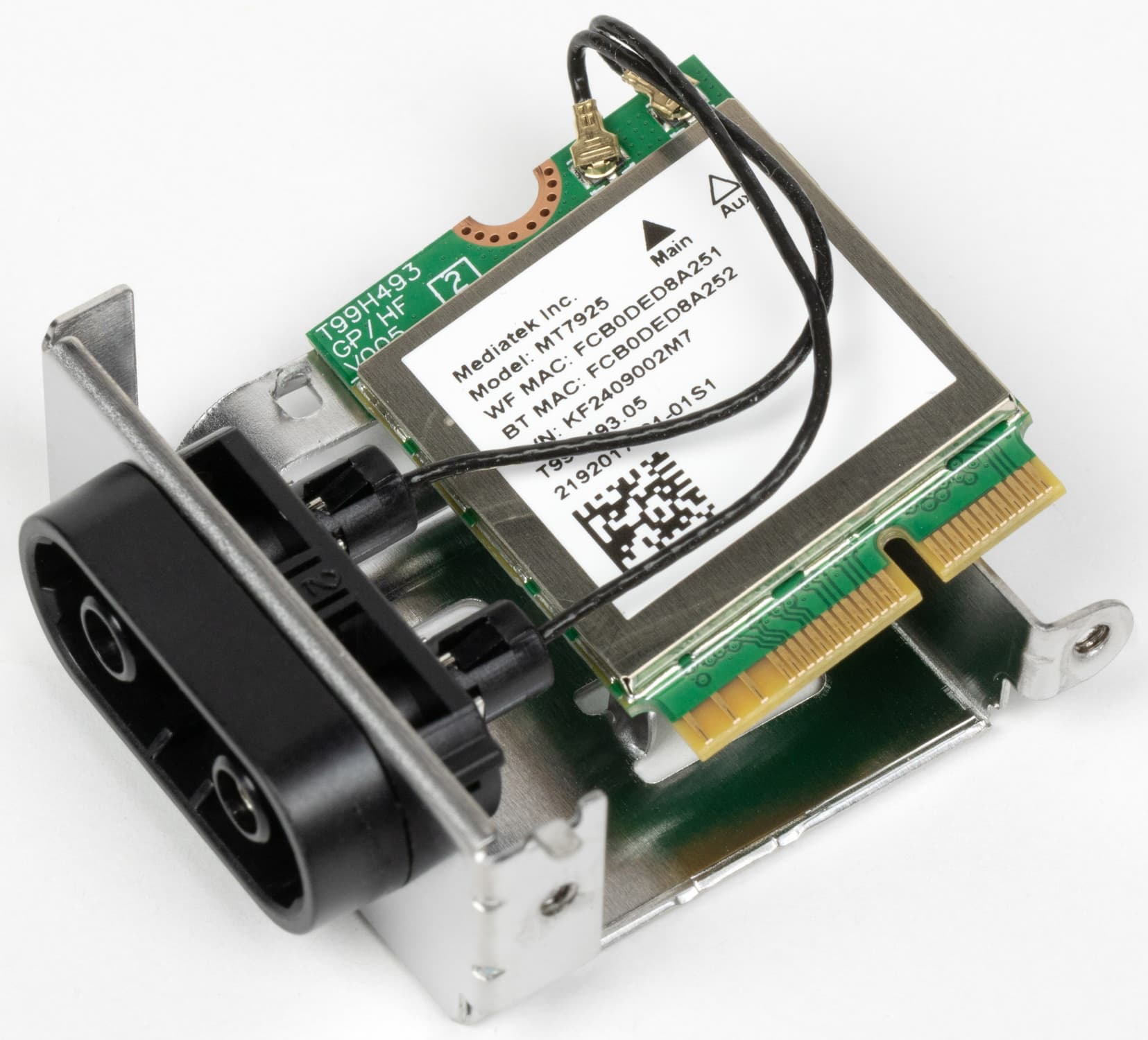 Имеется и комплексный беспроводной адаптер на контроллере MediaTek MT7925, через который реализованы Wi-Fi 7 (802.11a/b/g/n/ac/ax/be) и Bluetooth 5.4. Он установлен в слот M.2 (E-key), и его разъемы для привинчивания выносных антенн выведены на заднюю панель.