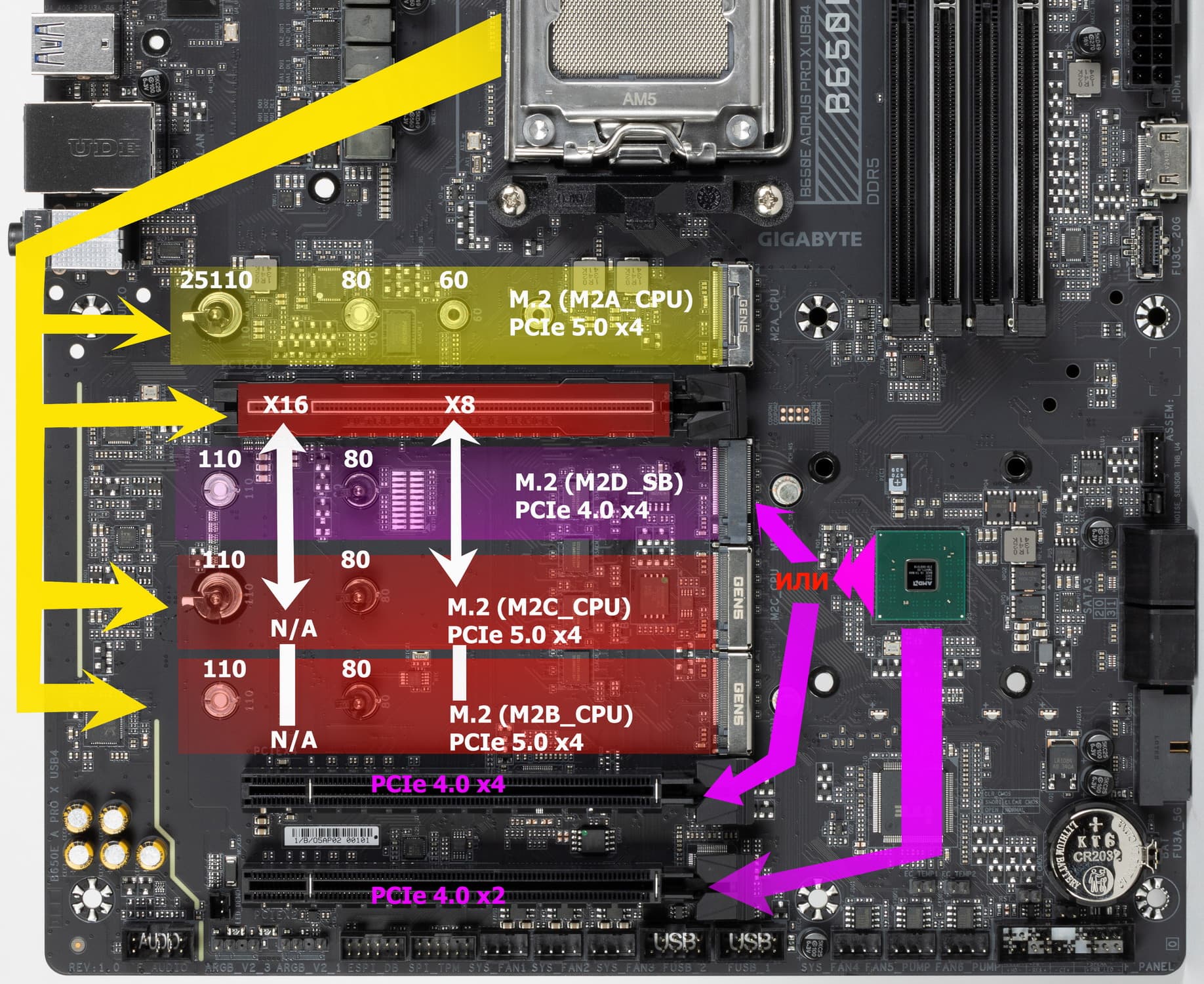 Выше приведена полная схема распределения ресурсов по слотам PCIe. Всего на плате есть 3 слота PCIe: один PCIe x16 PCIe 5.0, получающий данные от процессора, и два «длинных» слота, получающие данные от B650E, но работающие по схеме x4 и x2.