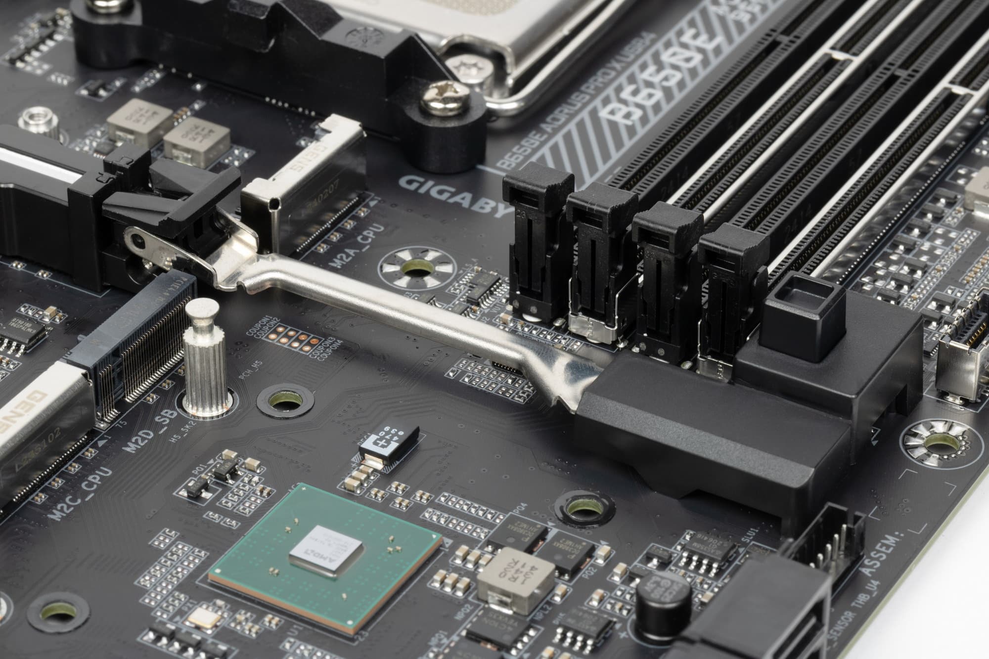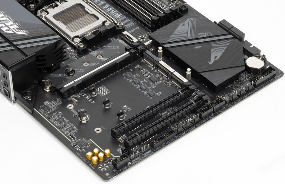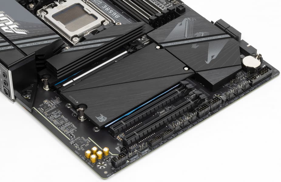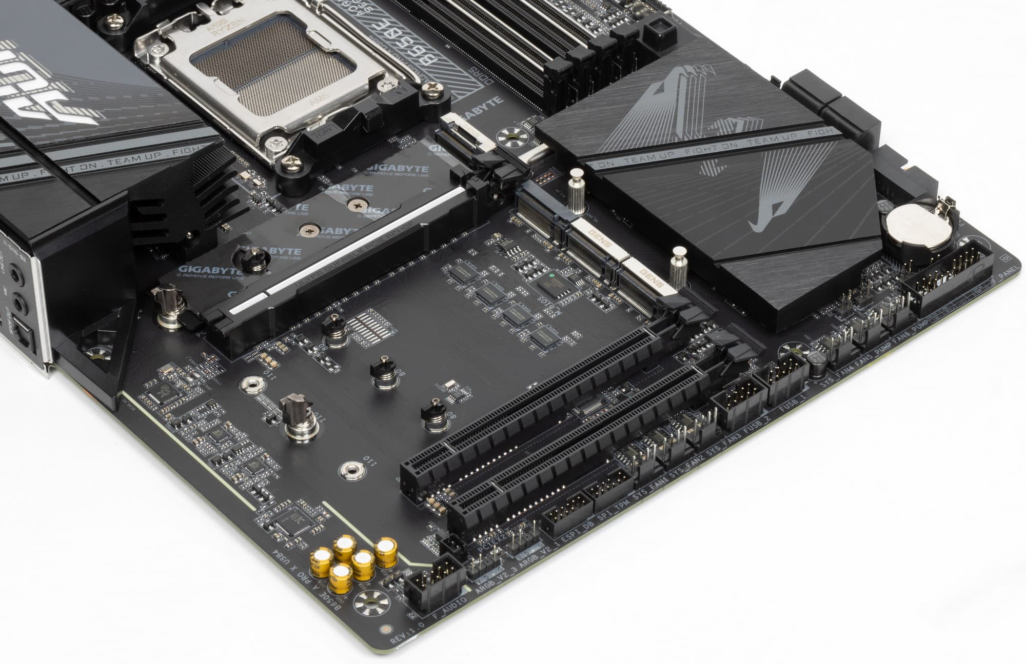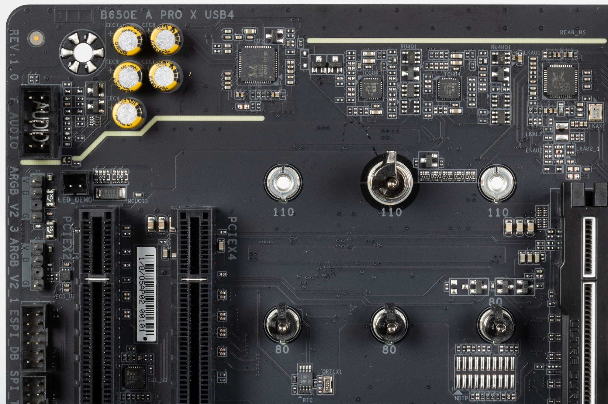 Все 4 слота поддерживают размеры модулей 22110/2280, также M2A_CPU поддерживает размер модулей 25110 и 2260. Все слоты работают с модулями только с PCIe интерфейсом, при этом три (M2A_CPU, M2B_CPU, M2C_CPU) из них получают данные от CPU, а один M2D_SB – от чипсета B650E.