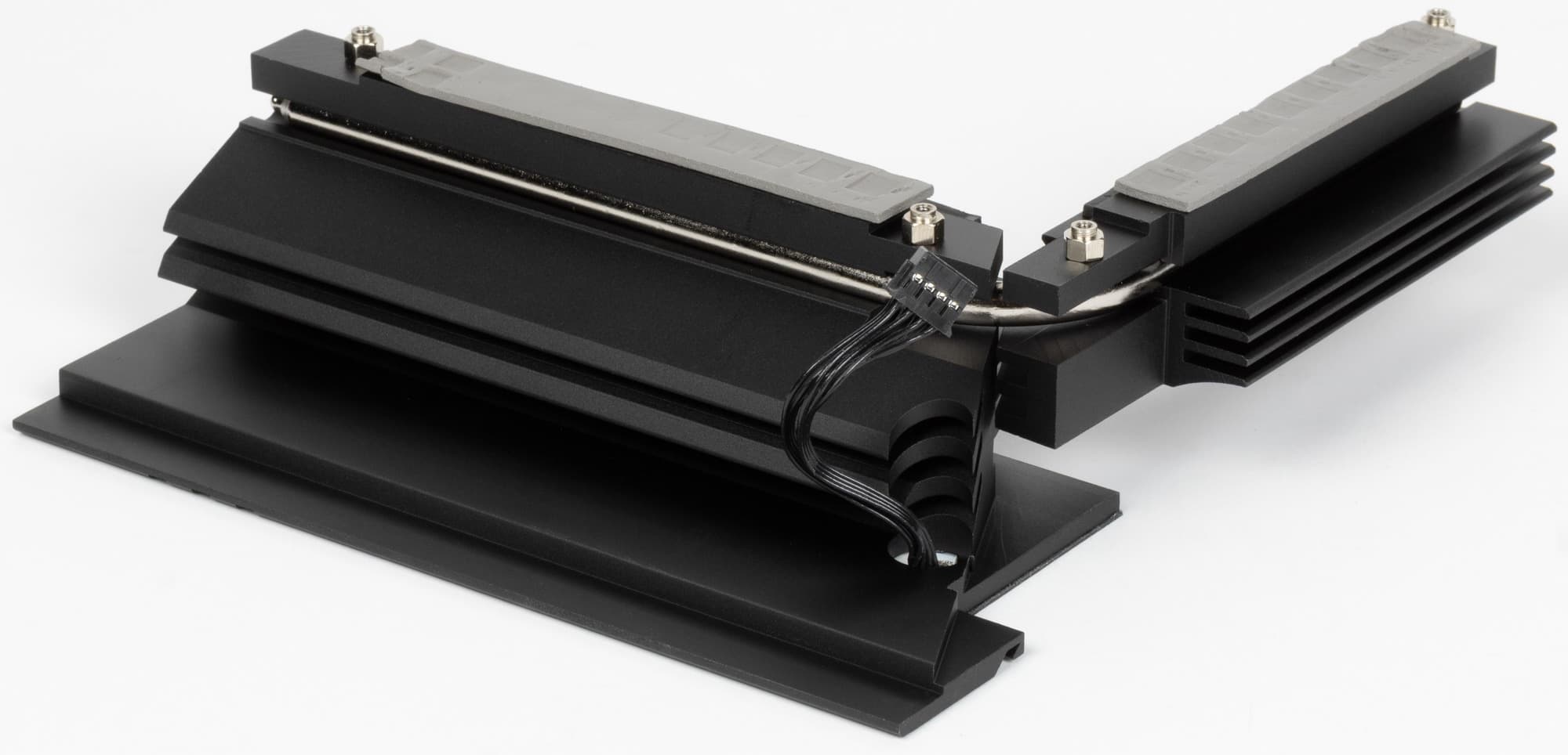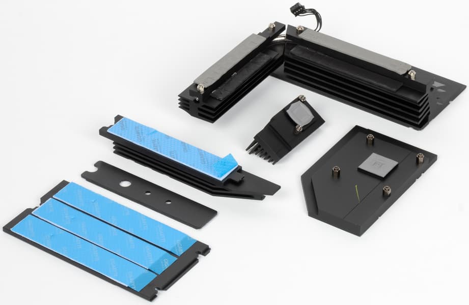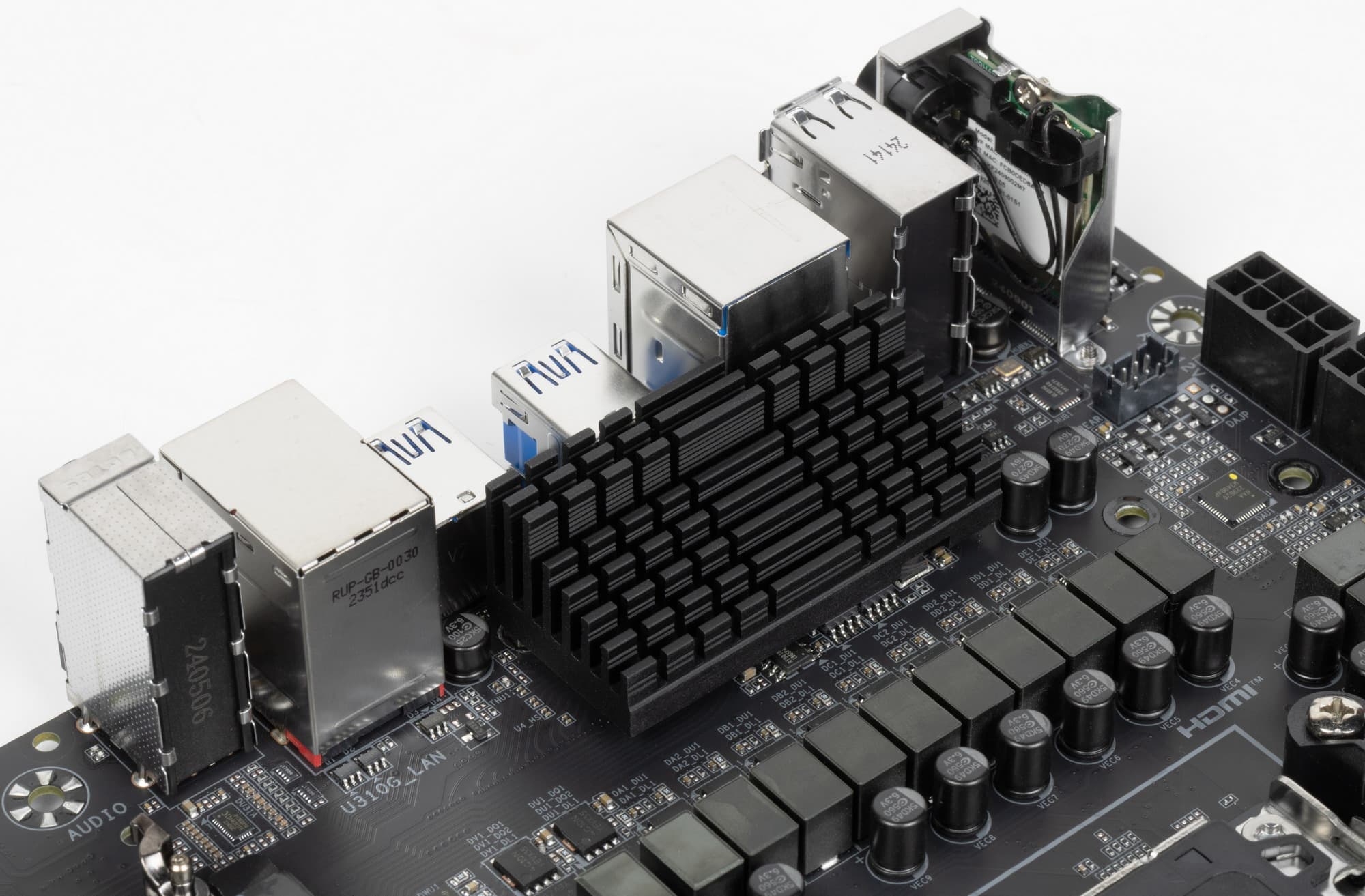 Две группы силовых преобразователей имеют свои раздельные радиаторы, соединенные тепловой трубкой. На контроллере USB4 от ASMedia установлен отдельный небольшой радиатор.