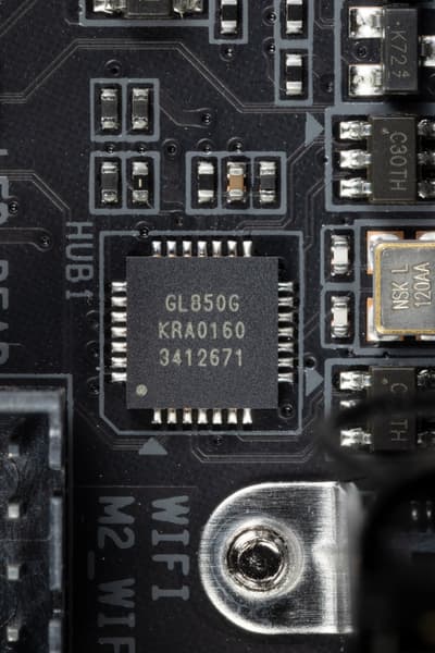 - 8 портов USB 2.0/1.1: 4 реализованы через B650E и представлены двумя внутренними разъемами (каждый на 2 порта); еще 4 реализованы через контроллер Genesys Logic GL850G (на него потрачена 1 линия USB 2.0 от CPU) и представлены 4 портами Type-A на задней панели (черные).