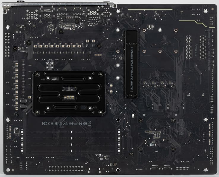 На оборотной стороне почти ничего нет, кроме жестких креплений процессорного сокета и слота PCIe 5.0 x16. Текстолит обработан хорошо: во всех точках пайки не только острые концы срезаны, но и все неплохо отшлифовано. Защитной пластины на задней стороне нет.