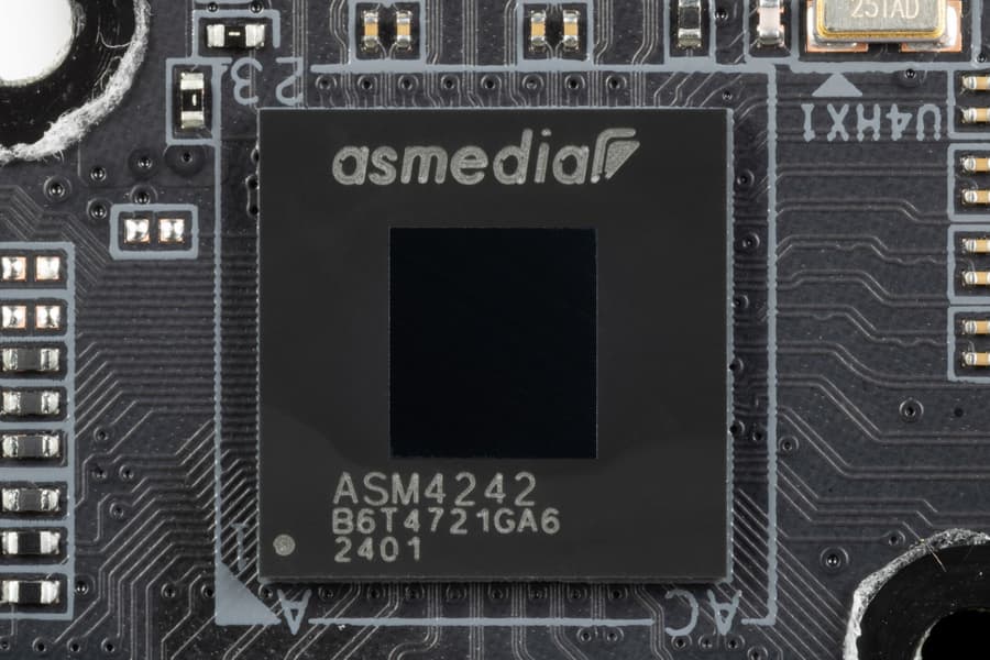 - 2 порта USB4: оба реализованы через контроллер ASMedia ASM4242 (на него потрачена 1 линия USB 3.2 Gen2 от CPU) и представлены на задней панели двумя портами Type-C;
