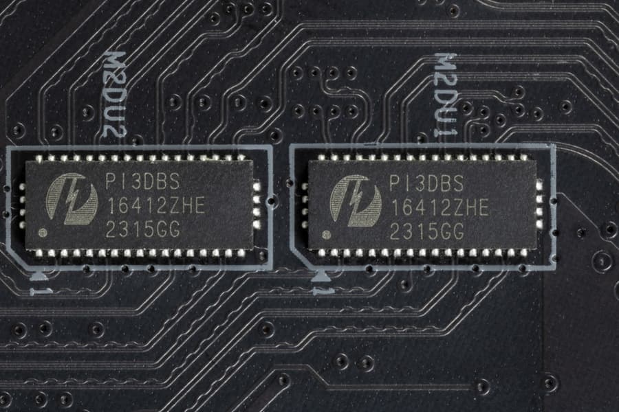 Для переключения ресурсов между слотом PCIe x16_2 и слотом M2D_SB используются мультиплексоры от Diodes Inc.