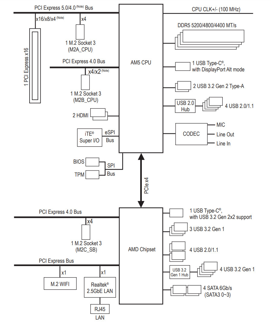 В процессорах Ryzen встроен контроллер High Definition Audio (HDA), связь с аудиокодеком идет путем эмуляции PCI шины. А также контроллер USB 2.0 Genesys Logic GL850G использует линию USB 2.0 от CPU, а Realtek RTS5411 использует 1 линию USB 3.2 Gen1 от B650E (детали ниже в разделе USB портов).