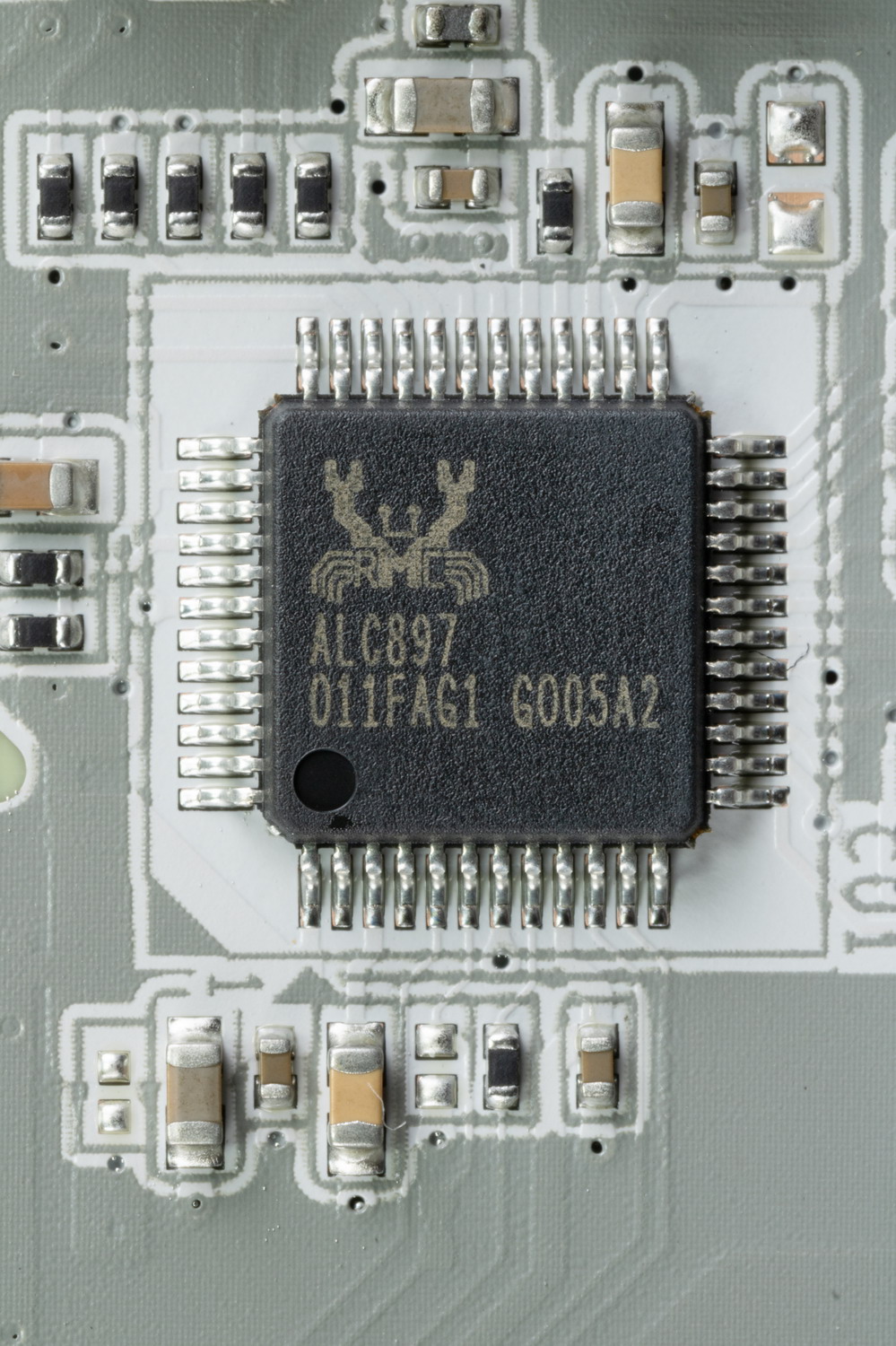 Данная материнская плата оснащена очень старым аудиокодеком Realtek ALC897. Он обеспечивает вывод звука по схемам до 7.1 с разрешением до 24 бит / 192 кГц. Для получения схемы 7.1 следует использовать три гнезда на задней панели матплаты, а также внутренний аудио-выход с материнской платы подключить к передней панели корпуса и в качестве 4го гнезда использовать Line-out на корпусе.