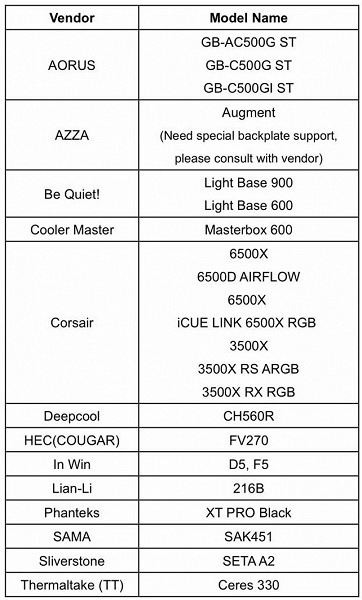 На сайте компании можно найти список совместимых корпусов, на момент подготовки обзора он выглядел так: