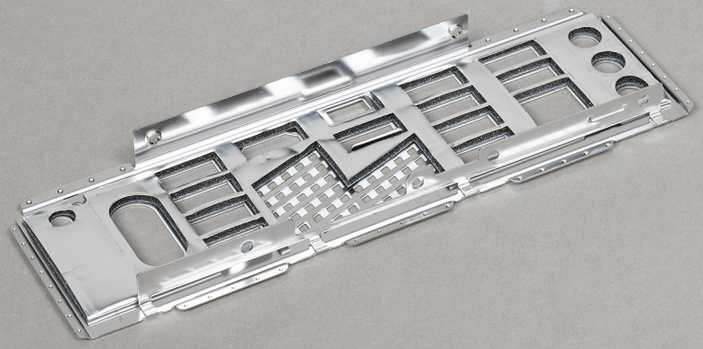 Материнская плата имеет бэкплейт с оборотной стороны, который имеет функции защиты матплаты, а также усиления жесткости.