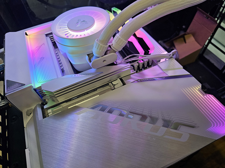 У всех модулей M.2, как я уже выше отмечал, есть свои радиаторы с термоинтерфейсом. У верхнего — свой отдельный радиатор, у двух остальных — общий.