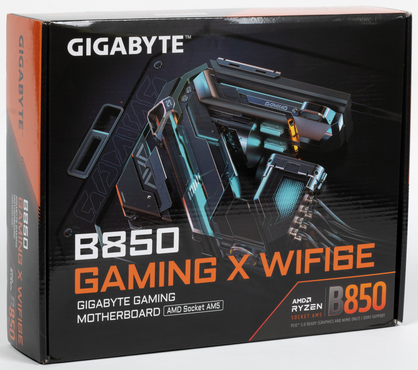 Gigabyte B850 Gaming X WiFi6E поставляется в традиционной из жесткого картона в фирменной черно-оранжевой цветовой гамме Gigabyte. Комплект размещен под платой в отдельном отсеке.
