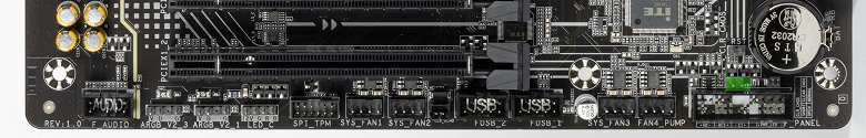 В арсенале этой модели также есть 4 порта SATA и 6 разъемов для вентиляторов. Система питания процессора относительно мощная. Плата имеет систему охлаждения для каждого потенциально греющегося элемента, включая накопители в слотах M.2. Сетевые возможности включают один проводной контроллер 2,5 Гбит/с и один беспроводной Wi-Fi 6E + Bluetooth 5.3. В числе плюсов платы можно упомянуть возможности для подключения дополнительных RGB-устройств.