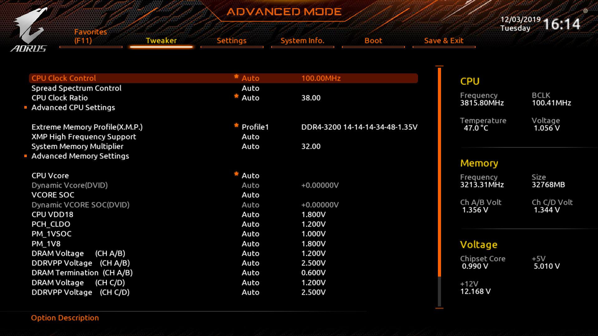 По умолчанию мы попадаем в «простое» меню, которое по сути информационное. Нажимаем F2 и попадаем уже в «продвинутое» меню для возможностей настроек. Раздел Tweaker полностью посвящен разгону и тонкой настройке работы CPU и памяти.