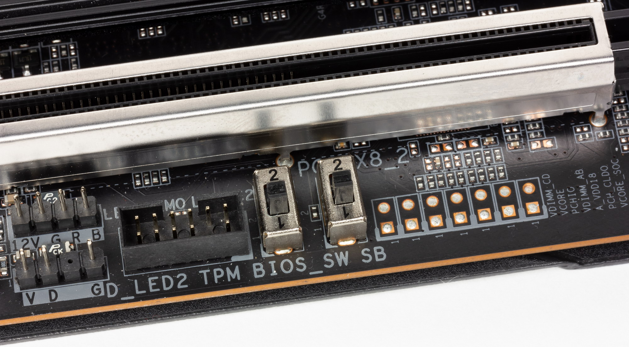 Всего у платы 10 разъемов Serial ATA 6 Гбит/с + 4 слота для накопителей в форм-факторе M.2. (Еще один слот M.2, спрятанный под кожухом блока разъемов задней панели, занят контроллером беспроводных сетей Wi-Fi/Bluetooth.). 8 портов SATA реализованы через чипсет TRX40 (4 порта — штатным набором плюс 4 порта — из свободных PCI-E линий, при этом есть деление ресурсов с одним слотом M.2 — об этом ниже).