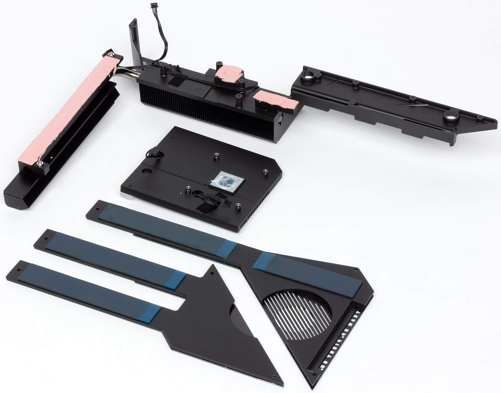 Для модулей M.2, как я уже выше отмечал, есть свои три радиатора с термоинтерфейсами. Они крепятся к большому чипсетному радиатору и также принимают участие в общей схеме охлаждения.