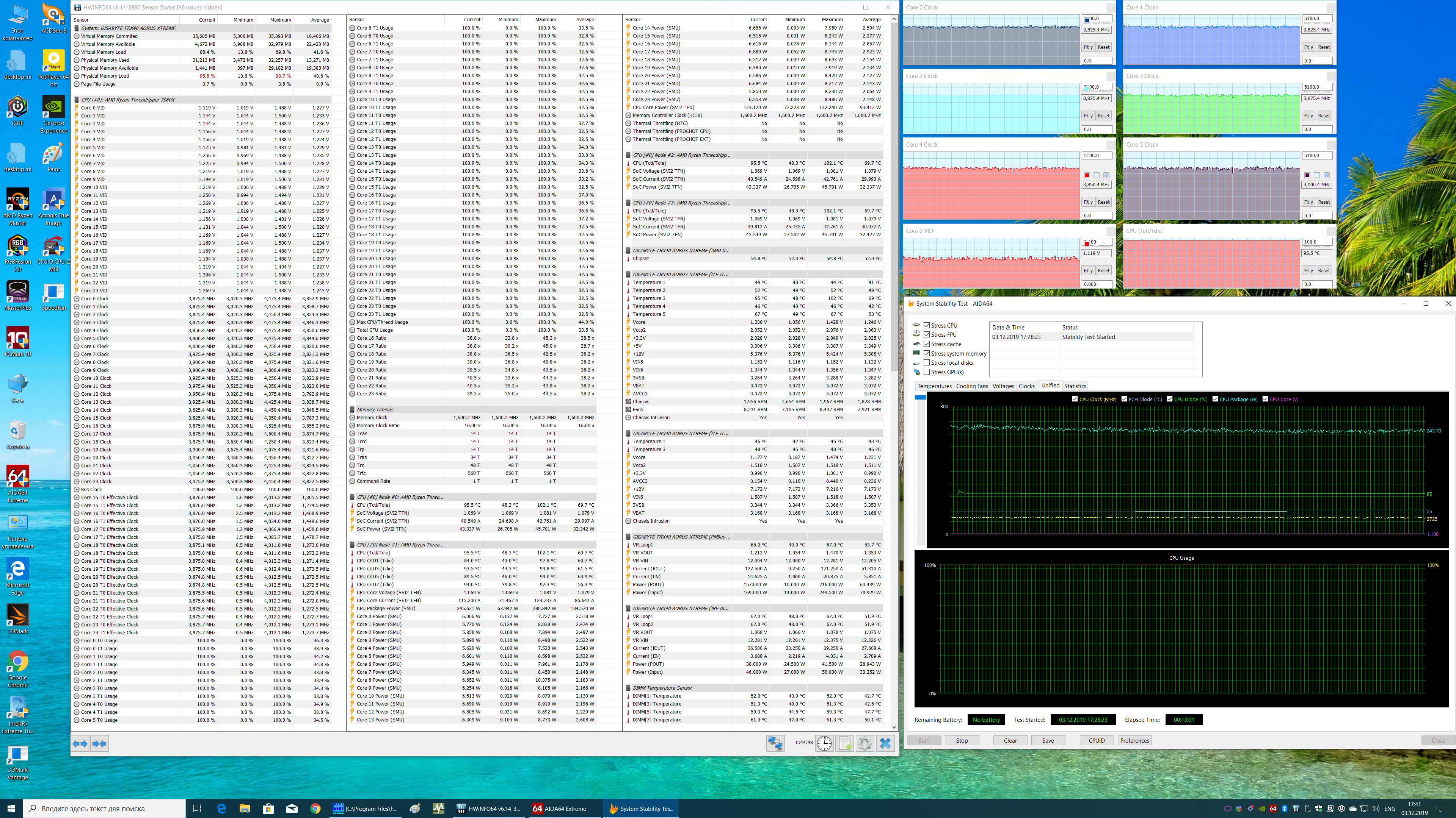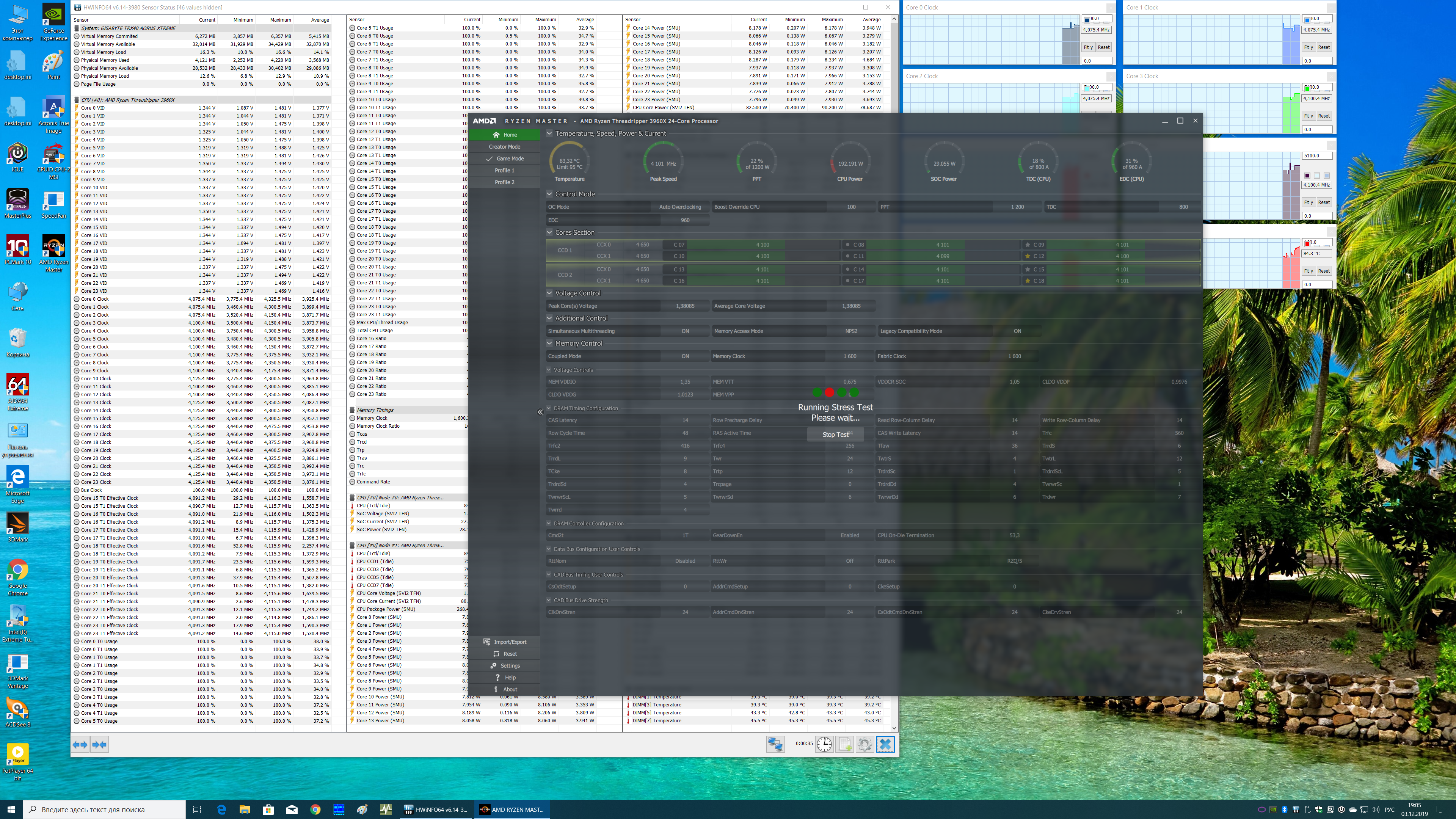 Как мы видим, частоты по ядрам меняются не сильно (3,9-4,0 ГГц), то есть разброс минимальный с разовыми всплесками до 4,4 ГГц (по 1-2 ядру). И даже при этом нагрев процессора был уже около 95-96 °C (в среднем)! Прекрасно видно, что даже такой AIO LCS, как наша, недостаточно для такого мощного процессора! И это мы просто запустили очень жесткий, стрессовый тест, не меняя никаких частот. При этом стоит отметить тот факт, что потребление CPU не было запредельным, всего около 220 Вт, когда как та же СО прекрасно охлаждала Intel Core i9-10980XE, который в режиме оверклокинга потреблял более 310 Вт! Так что, налицо узаконенный AMD разгон TR 3960X до предела.