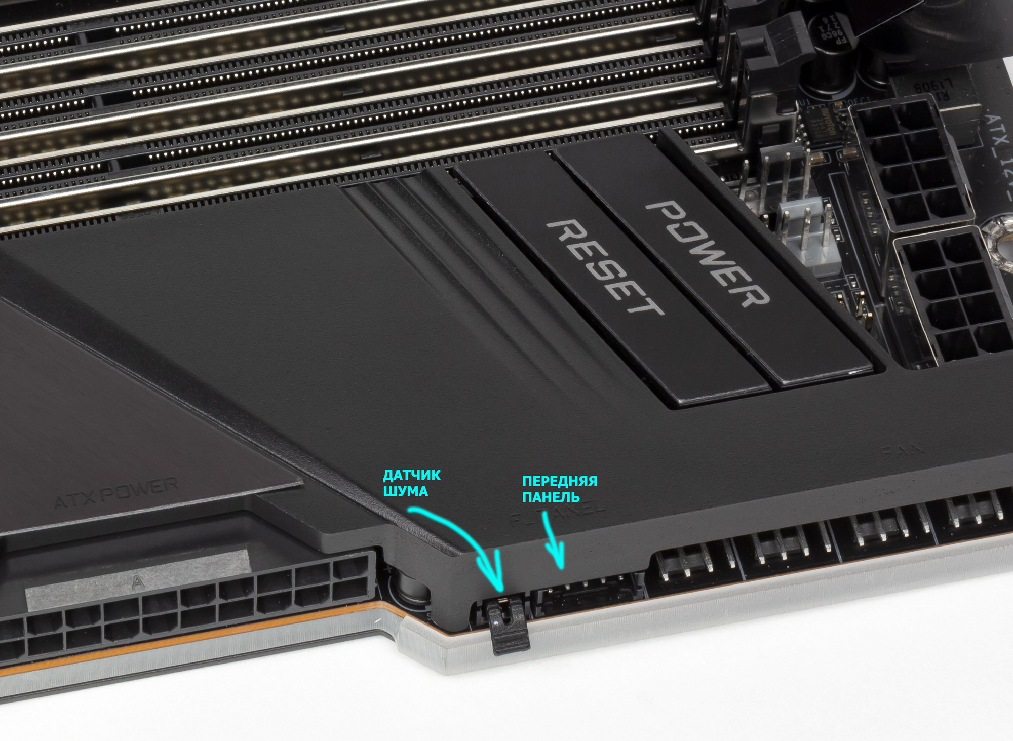 | Прочие внутренние элементы | 24-контактный разъем питания ATX 2 8-контактных разъема питания EPS12V 1 слот M.2 (E-key), занят адаптером беспроводных сетей 1 разъем для подключения порта USB 3.2 Gen2 Type-C 2 разъема для подключения 4 портов USB 3.2 Gen1 1 разъем для подключения 4 портов USB 2.0 (через адаптер-разветвитель) 7 разъемов для подключения 4-контактных вентиляторов (поддержка помп ЖСО) 2 разъема для подключения неадресуемой RGB-ленты 2 разъема для подключения адресуемой ARGB-ленты 1 разъем для детектора шума 1 разъем аудио для передней панели корпуса 1 разъем TPM 1 разъем для подключения управления с передней панели корпуса (через адаптер-удлинитель) 1 кнопка включения питания (Power) 1 кнопка перезагрузки (Reset) 2 разъема для подключения термодатчиков 2 переключателя режимов BIOS точки для измерения напряжений |