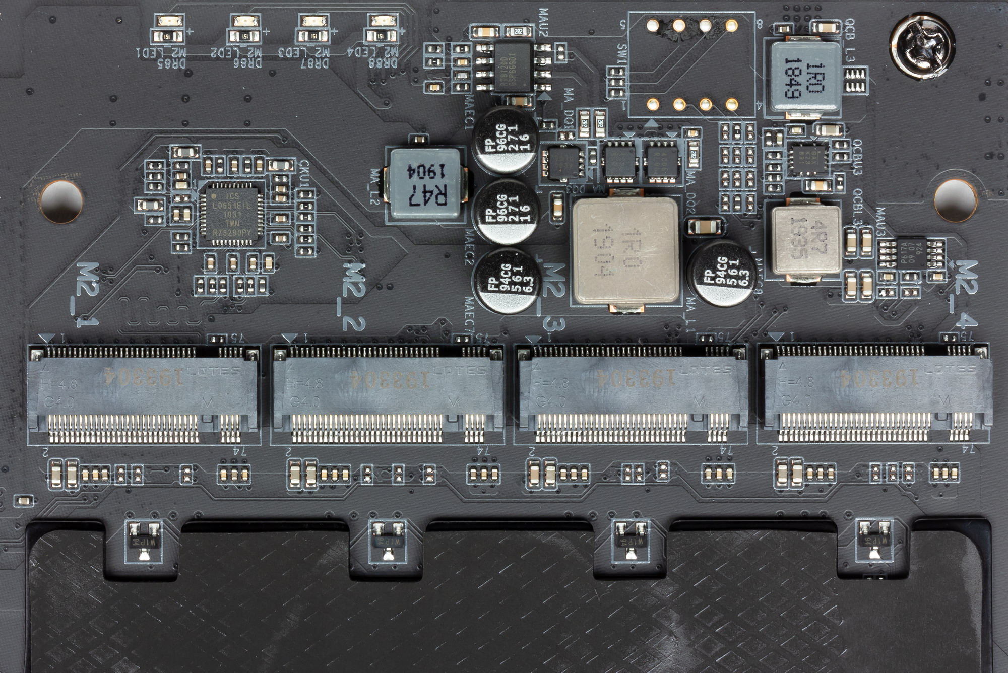 Разумеется, все накопители должны иметь интерфейс PCI-E. Учитывая, что все слоты PCI-E здесь управляются напрямую процессором, вставлять эту карту можно в любой свободный слот (разумеется, с учетом количества установленных модулей М.2 (понятно, что если на карте все 4 слота заняты, то ей потребуется слот с активными PCI-Eх16, если адаптер будет вставлен в PCI-Ex8, то видны будут только 2 гнезда М.2).
