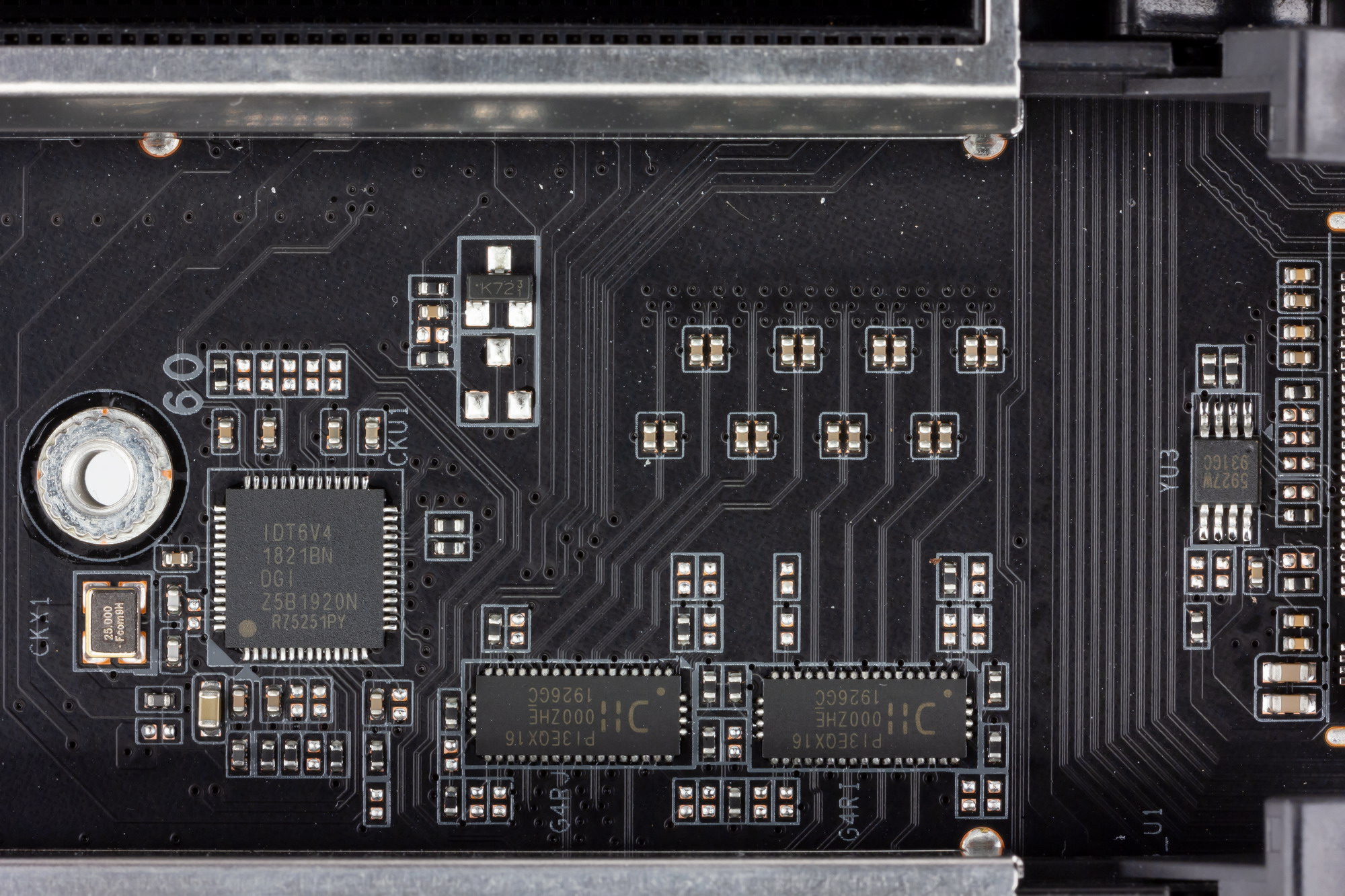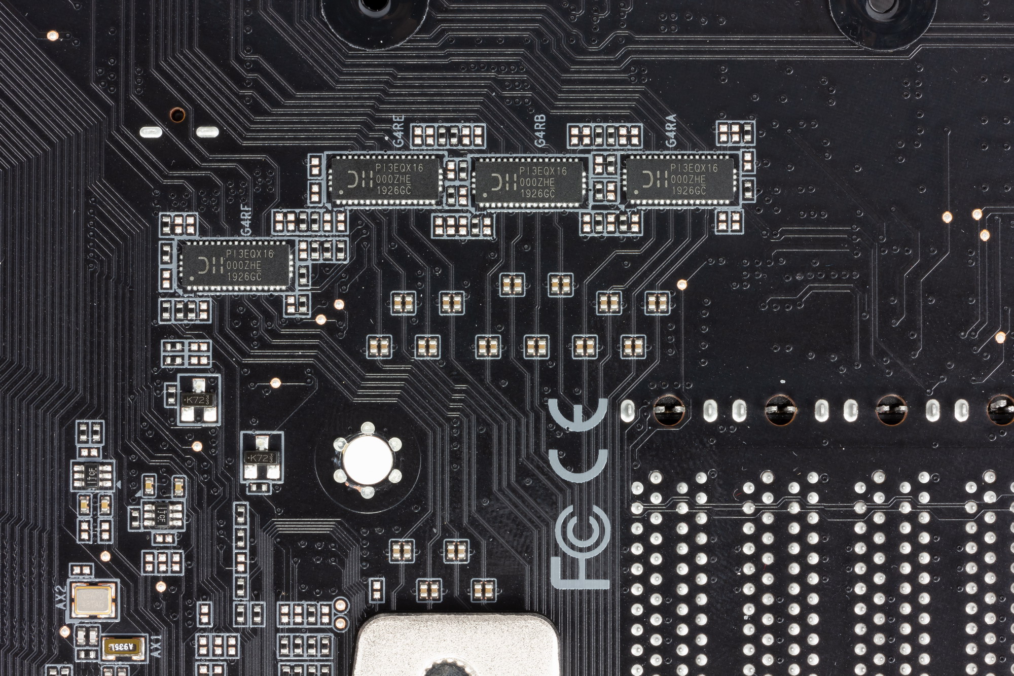 На оборотной стороне элементы имеются, в частности, ряд усилителей сигнала для шины PCI-E, и другая мелкая логика. Обработан текстолит очень хорошо: во всех точках пайки не только острые концы срезаны, но и все гладко отшлифовано. С той же стороны установлена пластина из алюминия с нанокарбоновым покрытием для предотвращения замыкания электроконтактов на PCB. Также пластина помогает отводить тепло от задней стороны PCB через термоинтерфейс и обеспечивает жесткость материнской платы. И даже сняв эту пластину, приятно взять в руки такой текстолит.