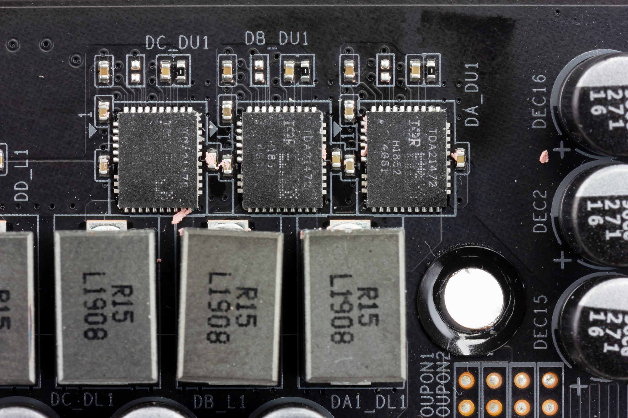 Каждый канал фазы имеет суперферритовую катушку и MOSFET IR TDA21472 на 70 A того же Infineon.