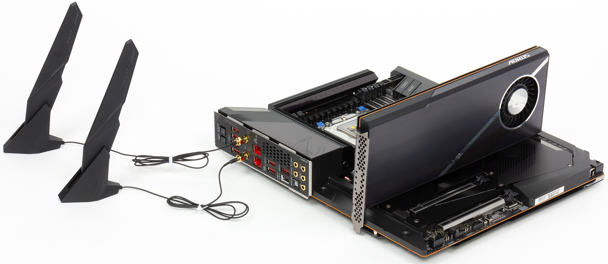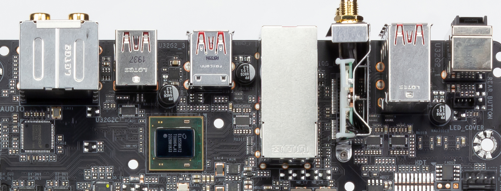 Имеется и комплексный беспроводной адаптер на контроллере Intel AX-200NGW, через который реализованы Wi-Fi 6 (802.11a/b/g/n/ac/ax) и Bluetooth 5.0. Он установлен в слот M.2 (E-key), и его разъемы для привинчивания выносных антенн выведены на заднюю панель.