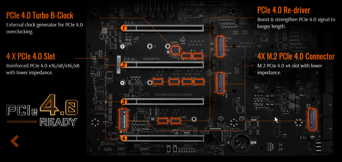 Но моя задача акцентировать внимание на том, что спутником новой линейки Threadripper 3xxx стал чипсет TRX40. Понятно, почему потребовался новый чипсет (в отличие от Intel, где выпуск новых Core i9-10xxxX не потребовал производства нового чипсета, со всем по-прежнему справляется X299): поддержка новой версии шины PCI-E 4.0 в целом и резкое увеличение (в 4 раза) скорости обмена данными по внутренней шине «процессор-чипсет». Плюс заодно некоторое внесение в изменение дизайна.