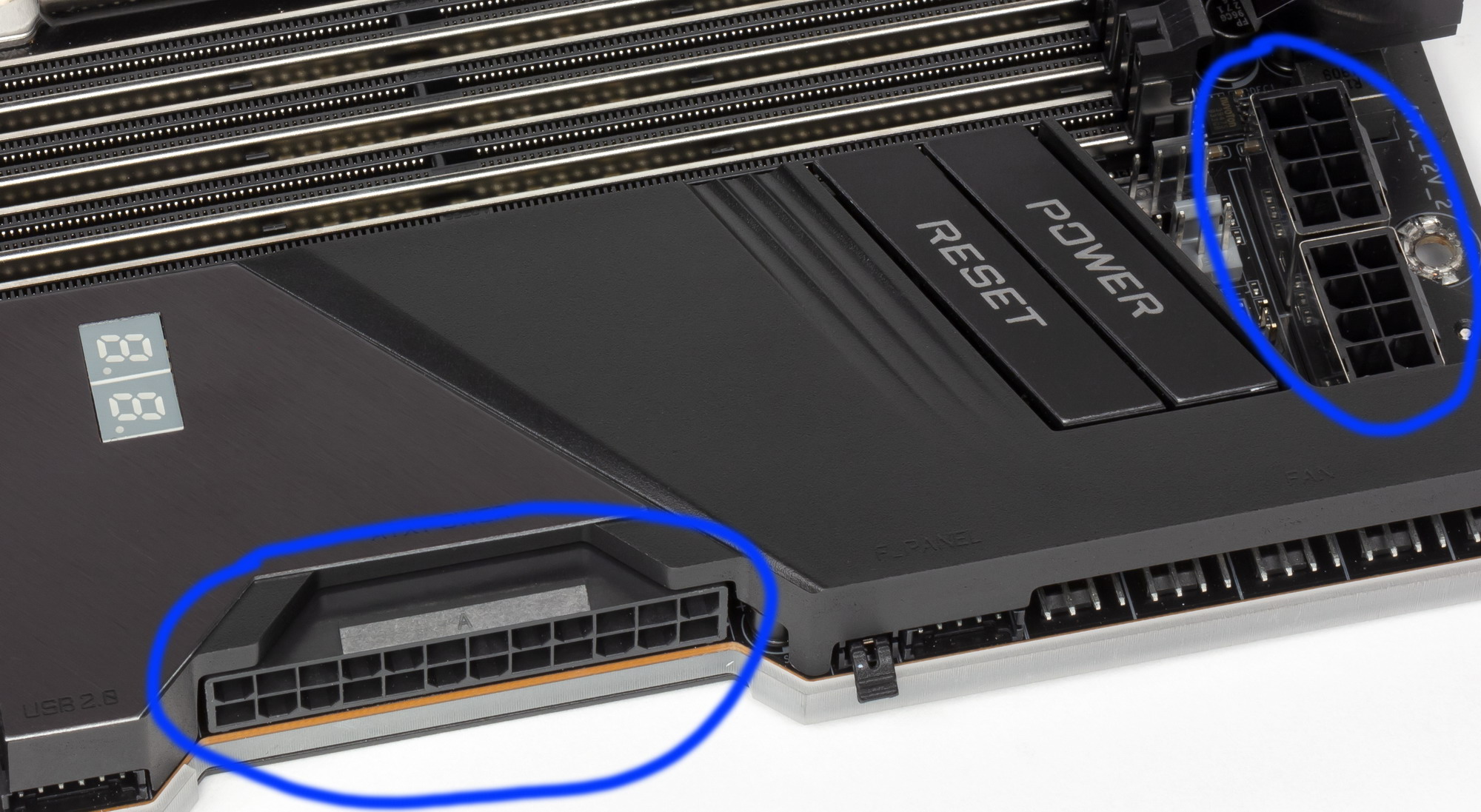 Для питания платы на ней предусмотрены 3 разъема: в дополнение к 24-контактному ATX здесь есть еще два 8-контактных EPS12V. Также имеется 6-контактный разъем дополнительного питания PCI-E на случай установки двух или трех видеокарт (выше уже о нем писал). Его использование опционально.