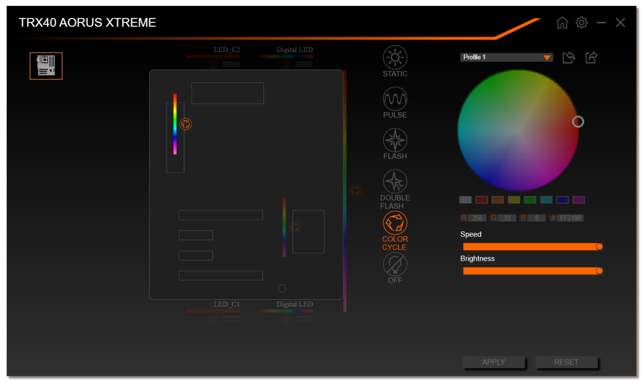 Топовые платы Aorus всегда отличаются очень красивой подсветкой. Обычно светодиоды образуют яркие эффекты на кожухе, покрывающем задний блок с разъемами, а также подсвечены радиатор чипсета и кожух над блоком аудио. Однако в данном случае разработчики как-то явно поскупились: на кожухе (по сути радиаторе) кроме скромной надписи «Aorus» подсветки нет (не считая еще табло с POST-кодами), также нет подсветки и над аудиоблоком. И только чипсетный радиатор вместе с боковой полосой, идущей вдоль правой стороны платы, создают некий красочный эффект. Подчеркивание позиционирования HEDT? — Но у тех же топовых плат на Intel X299 с подсветкой все намного богаче. Тем не менее, мы помним про 4 разъема для подключения внешней подсветки, и всем этим можно управлять через программу RGB Fusion.