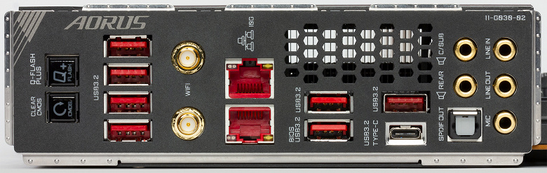 | Разъемы на задней панели | 1 × USB 3.2 Gen2 (Type-C) 7 × USB 3.2 Gen2 (Type-A) 2 × RJ-45 5 аудиоразъемов типа миниджек 1 × S/PDIF (оптический, выход) 2 антенных разъема кнопка сброса CMOS кнопка перепрошивки BIOS — Q-Flash+ |