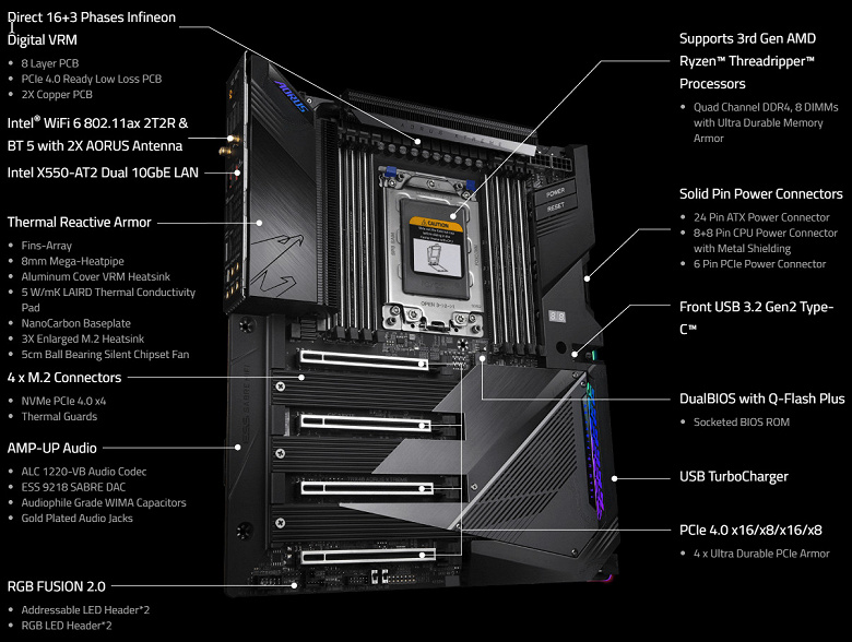Еще раз надо напомнить, что Gigabyte TRX40 Aorus Xtreme поддерживает процессоры AMD Ryzen Threadripper 3-го поколений, выполненные под разъем (сокет) sTR4X.