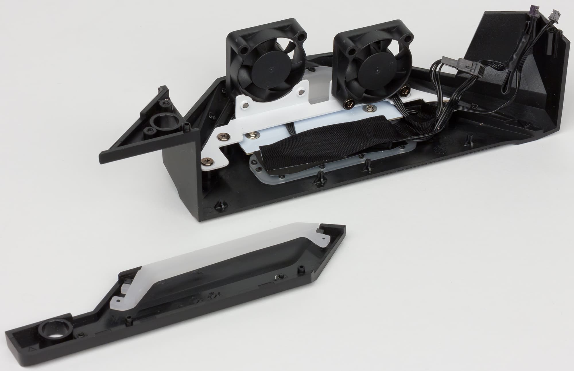 В кожух задней панели разъемов встроены два вентилятора, которые отводят тепло от радиатора сетевого контроллера Aquantia AQC107 и элементов регулятора напряжения питания процессора.