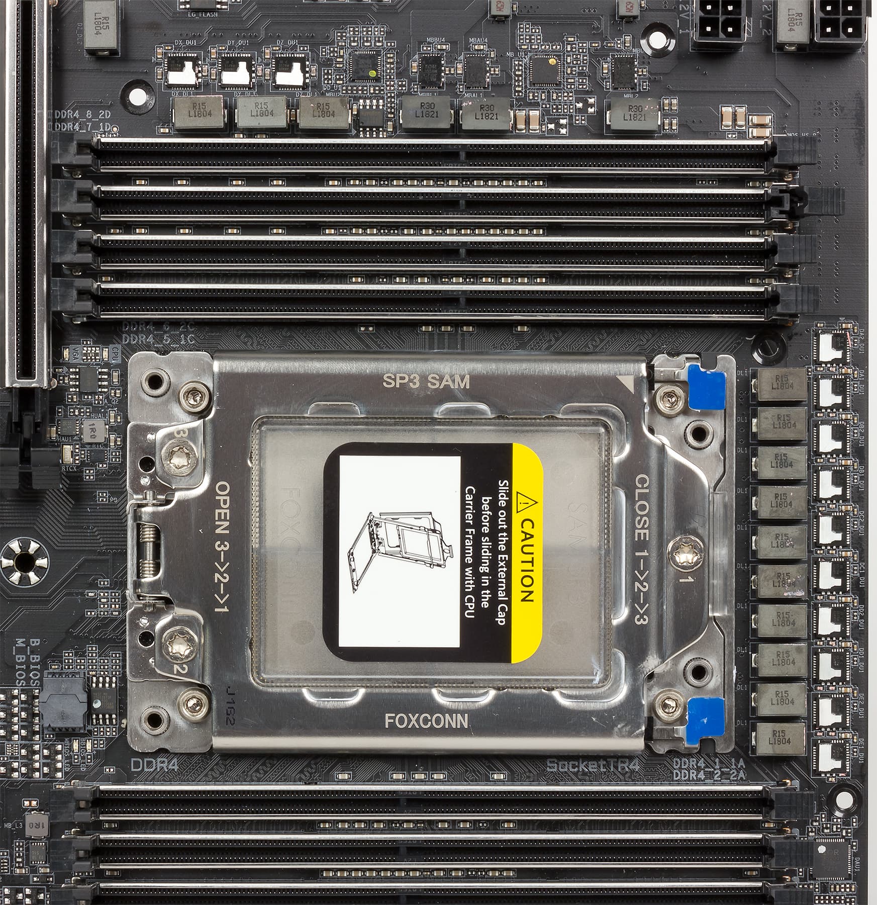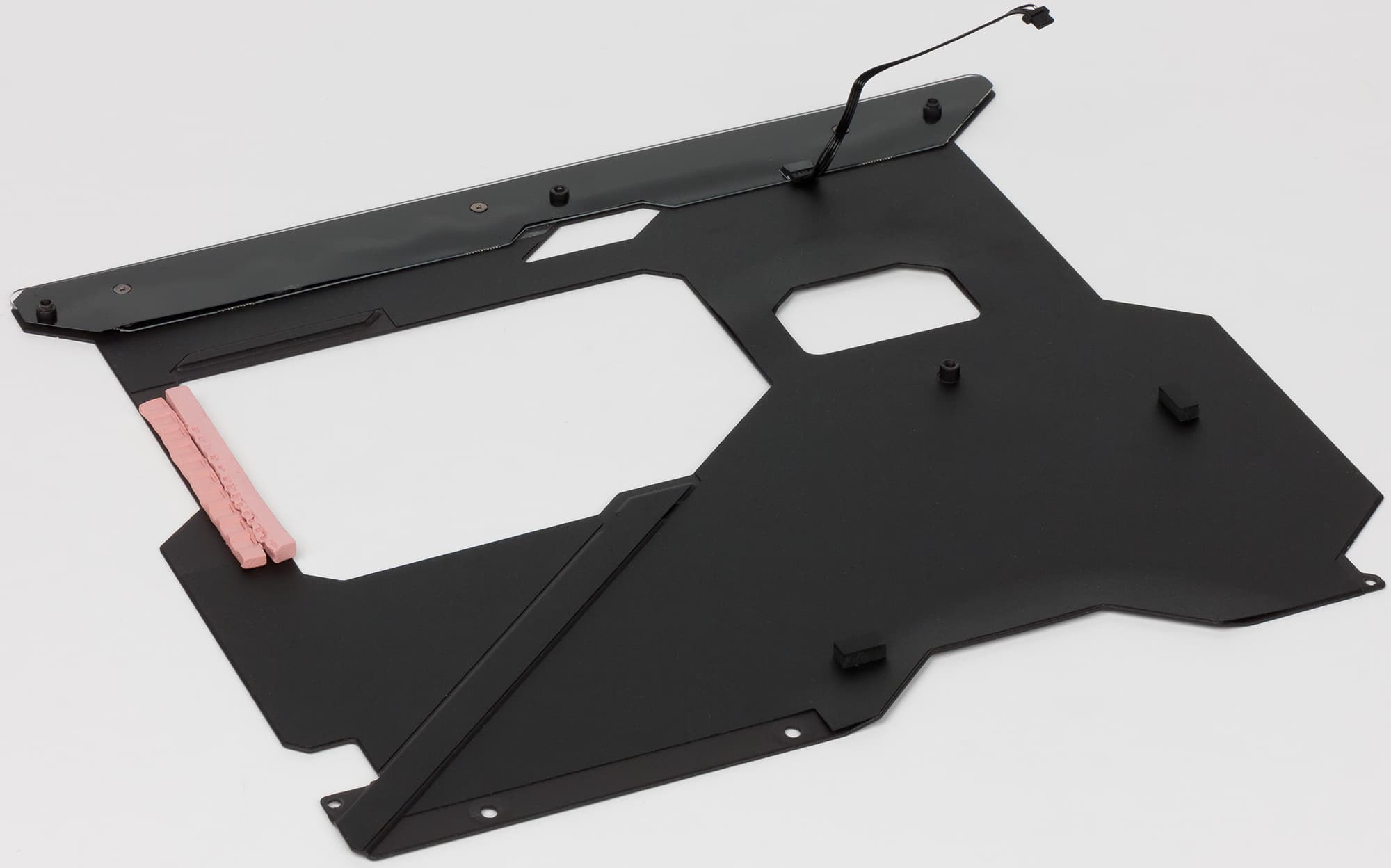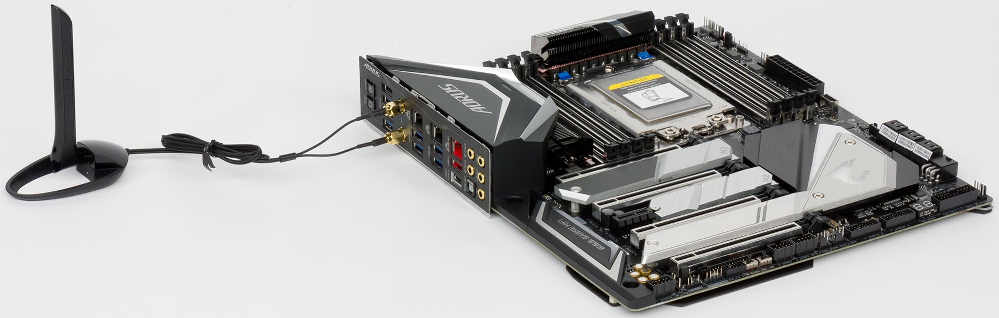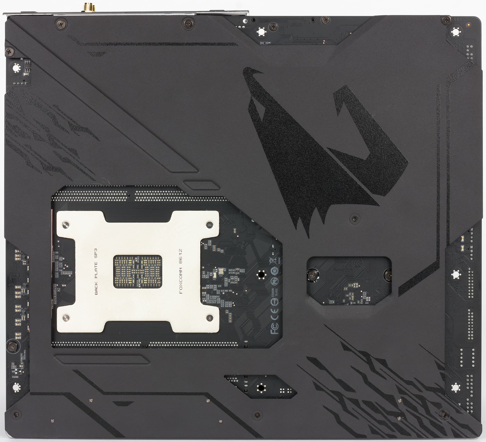 Следующая особенность X399 Aorus Xtreme — это наличие металлической пластины с обратной стороны платы, которая, во-первых, придает плате дополнительную жесткость, во-вторых, выполняет декоративную функцию, а в-третьих, выполняет функцию радиатора для элементов регулятора напряжения питания процессора.