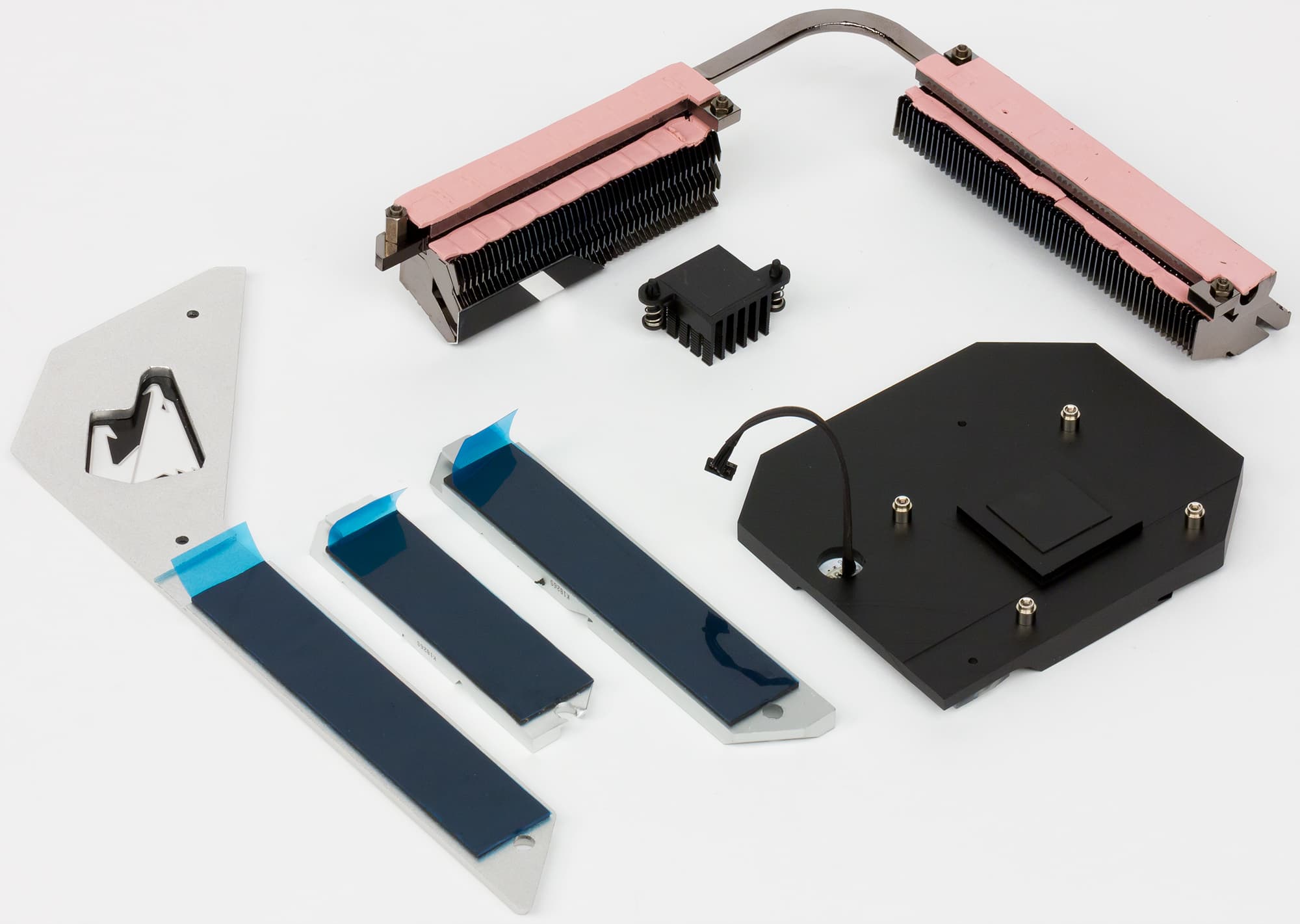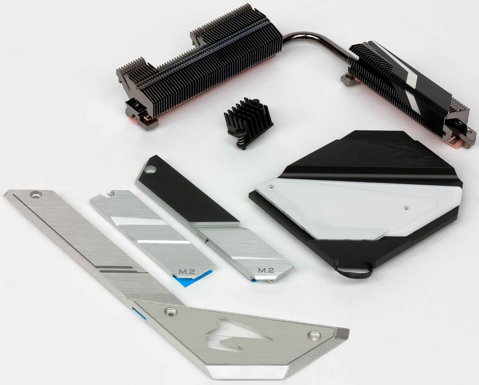 Система охлаждения платы состоит из нескольких радиаторов. Два радиатора, связанные тепловой трубкой, расположены по смежным сторонам процессорного разъема и предназначены для отвода тепла от элементов регулятора напряжения питания процессора. Еще один радиатор охлаждает чипсет. Есть и три отдельных радиатора для накопителей, устанавливаемых в разъемы M.2. Кроме того, небольшой радиатор устанавливается на 10-гигабитный сетевой контроллер Aquantia AQC107.