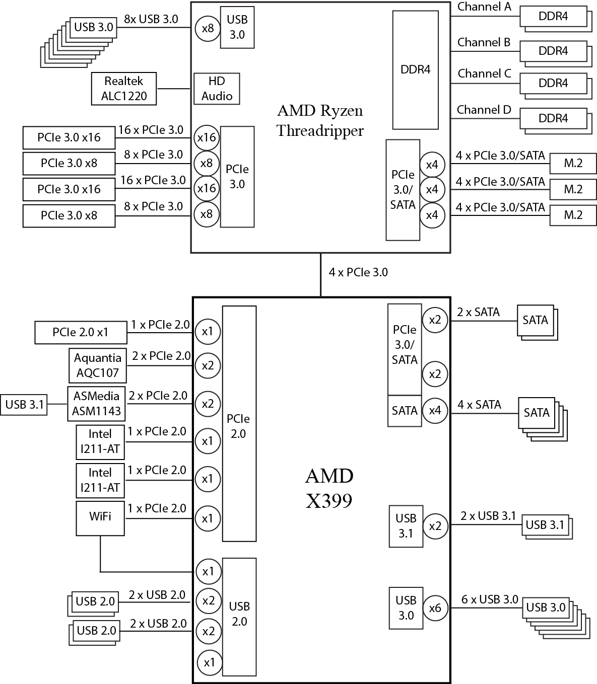 Если предположить, что контроллеры ASMedia ASM1143 и Aquantia AQC107 подключены двумя линиями PCIe 2.0 каждый, то восьми линий PCIe 2.0 чипсета AMD X399 будет достаточно.