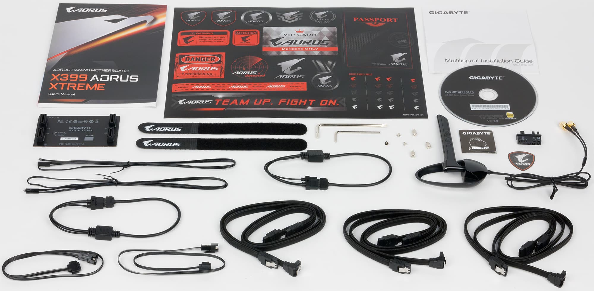 Комплект поставки включает в себя руководство пользователя, шесть SATA-кабелей (все разъемы с защелками, три кабеля имеют угловой разъем с одной стороны), DVD-диск с драйверами, антенну для Wi-Fi-модуля, два кабеля для подключения RGB-лент, два кабеля для подключения цифровых светодиодных лент, два термодатчика и традиционные стикеры.