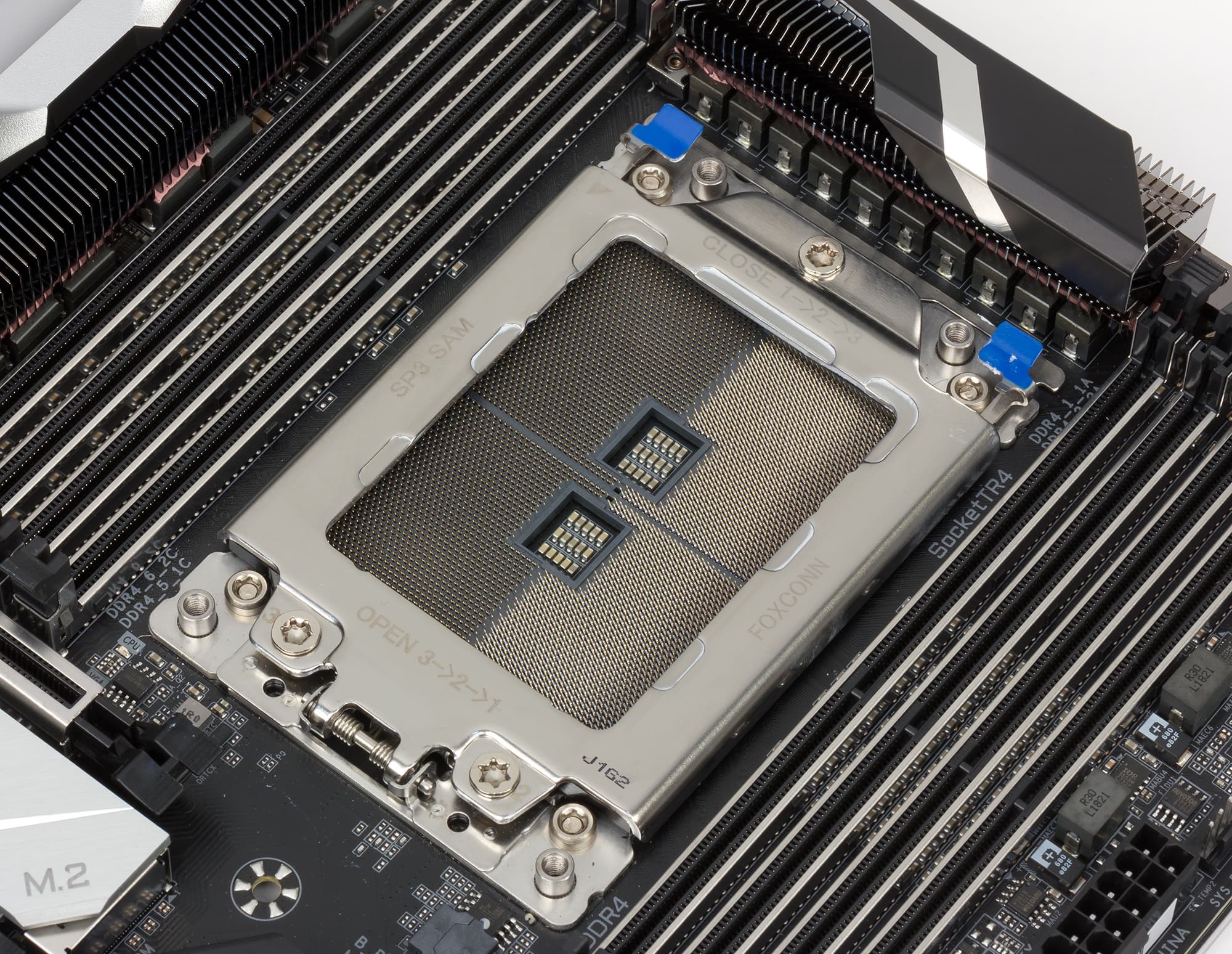 Оставшиеся 12 процессорных линий PCIe 3.0 используются для реализации трех разъемов M.2, предназначенных для установки накопителей. Два разъема M.2 поддерживают накопители типоразмера 2260/2280/22110, а еще один — 2242/2260/2280. Все три разъема M.2 поддерживают накопители с интерфейсами PCIe 3.0 x4/x2 и SATA (интерфейс SATA также реализован через процессор AMD Ryzen Threadripper). Отметим, что для всех накопителей, устанавливаемых в разъемы M.2, предусмотрены радиаторы.
