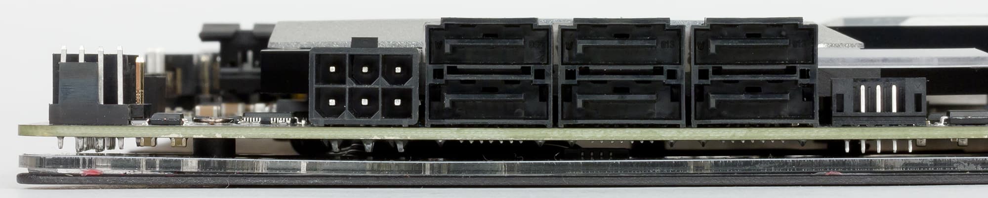 Для подключения блока питания на плате X399 Aorus Xtreme имеется стандартный 24-контактный и два 8-контактных разъема. Вдобавок к этому есть 6-контактный разъем (он расположен в зоне разъемов SATA), через который подается дополнительное питание для видеокарт.