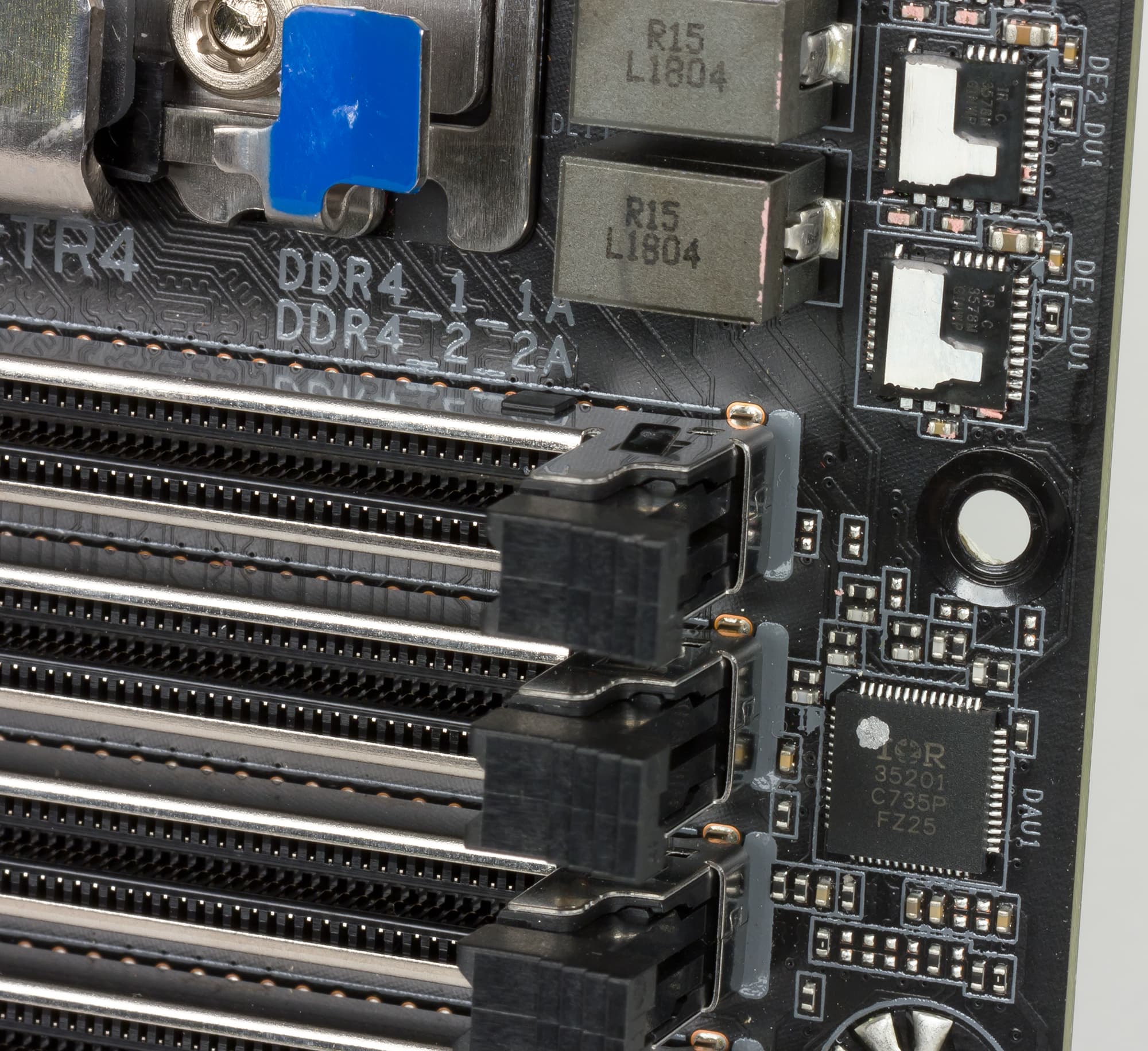 Для подключения накопителей или оптических приводов на плате предусмотрено шесть портов SATA 6 Гбит/с, которые реализованы на базе интегрированного в чипсет AMD X399 контроллера.
