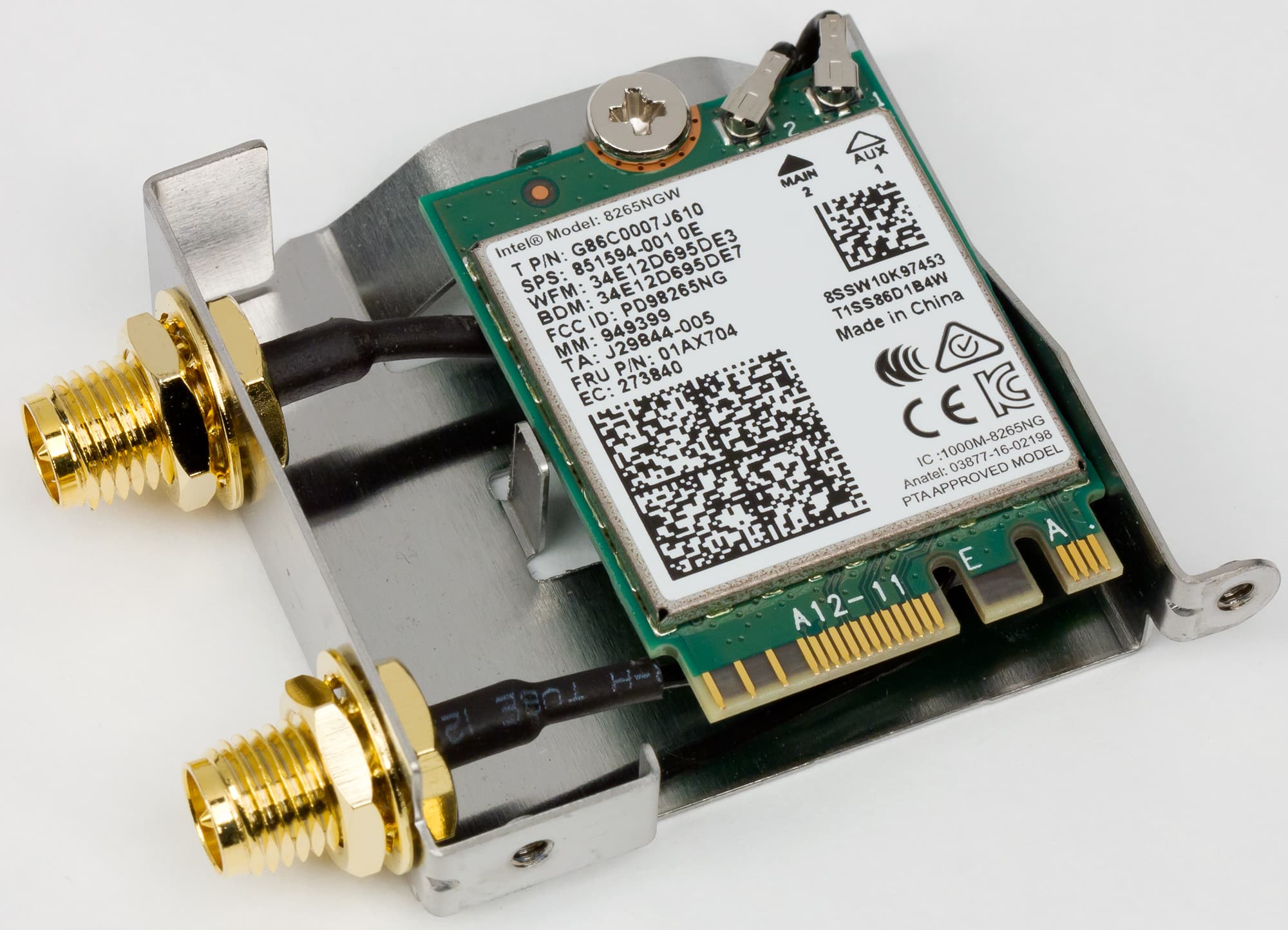 Кроме того, есть модуль беспроводной связи Intel 8265NGW, который поддерживает стандарты 802.11a/b/g/n/ac и Bluetooth 4.2. Этот модуль установлен в разъем M.2 с ключом E-типа, для реализации которого используется две чипсетных линии PCIe 2.0 и один порт USB 2.0.