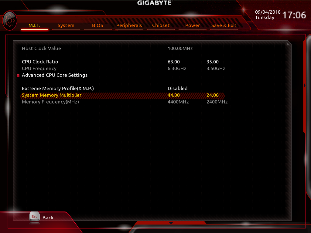 Максимальный коэффициент умножения, который можно установить для процессора, равен 63. Соответственно, максимальная частота процессора равна 6,3 ГГц. Максимальный коэффициент умножения для памяти равен 44, то есть максимальная частота памяти равна 4,4 ГГц.