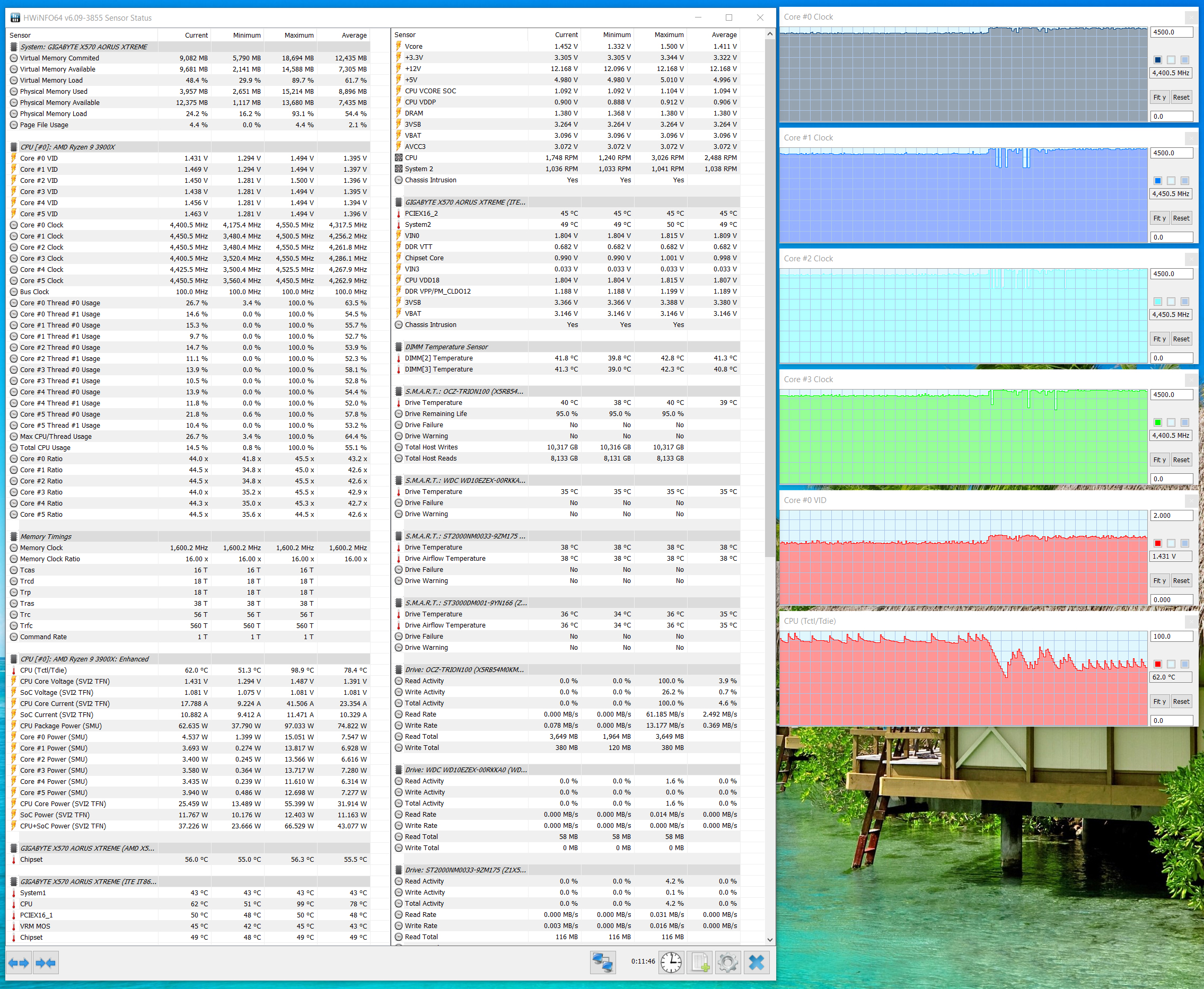 Да, частоты работы ядер почти выровнялись до 4,2—4,4 ГГц, однако нагрев был уже подчас около критических значений, поэтому Precision Boost 2 сбрасывал частоты, поддерживая температуру на процессоре не выше 95-98 градусов. Нагрев чипсета и области VRM не изменился.