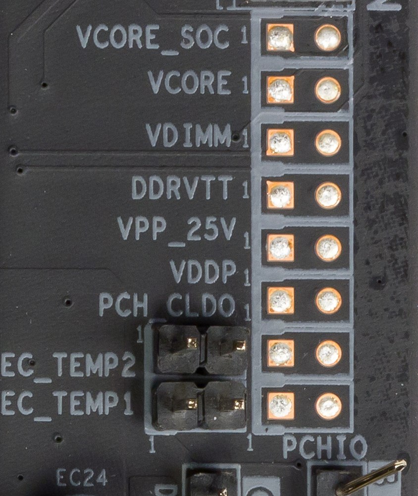Материнская плата также имеет площадки для измерения напряжений процессора, памяти и т. д.