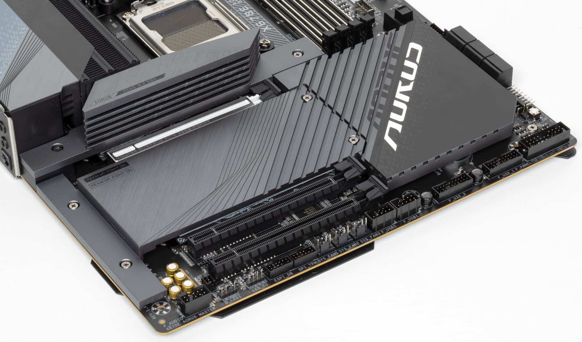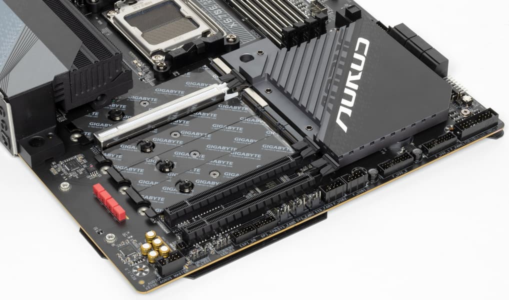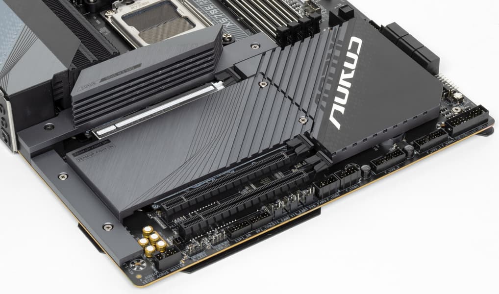Все M.2 слоты имеют радиаторы. Верхний M2A_CPU обладает отдельным радиатором, когда как остальные M.2 имеют общий радиатор. Надо еще раз отметить, что два М.2 слота получают данные от CPU, другие два — от X670E. Все 4 слота не делят ресурсы ни с какой иной периферией.