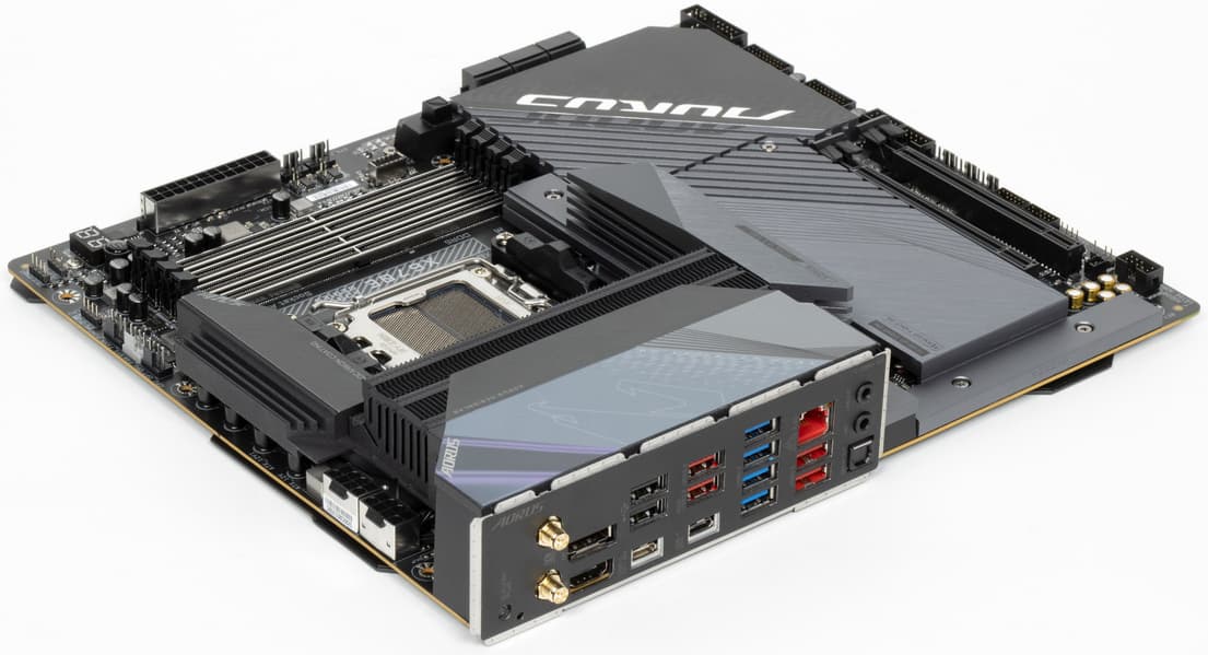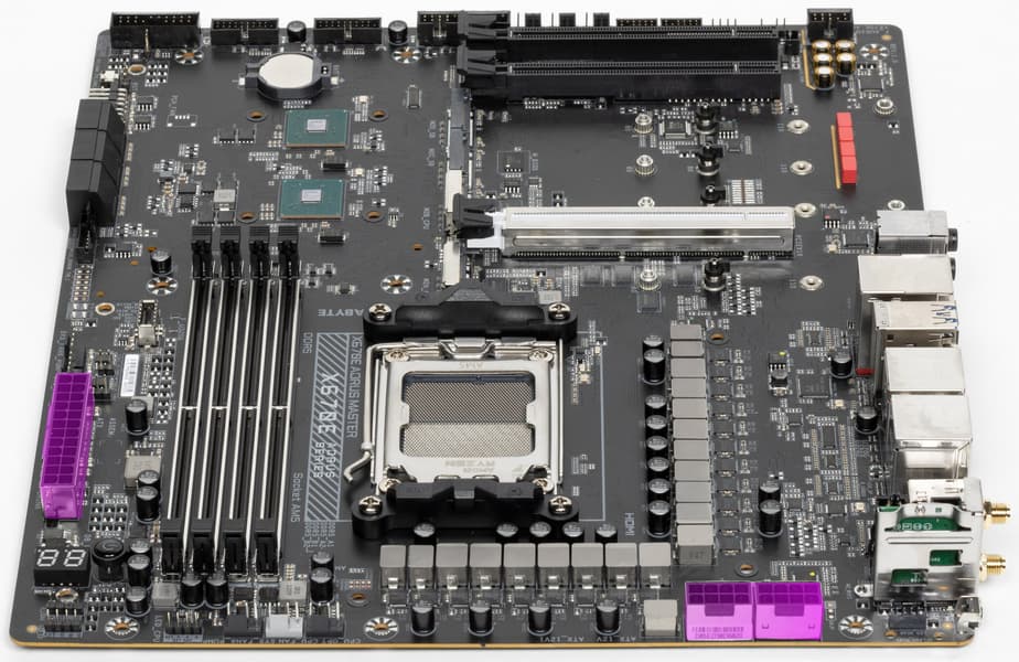 У Gigabyte X670E Aorus Master имеется 21 порт USB разных видов, включая 2 самых быстрых USB 3.2 Gen2×2. Плата предлагает слот PCIe х16 (он получает от процессора 16 линий PCIe 5.0) и аж 4 слота M.2, два из которых подключены напрямую к процессору линиями PCIe 5.0, а остальные — к чипсету линиями PCIe 4.0. У платы есть еще 2 слота PCIe x16, которые работают в режиме х4 и х2.