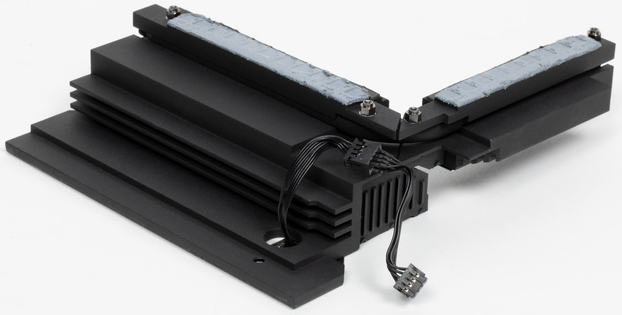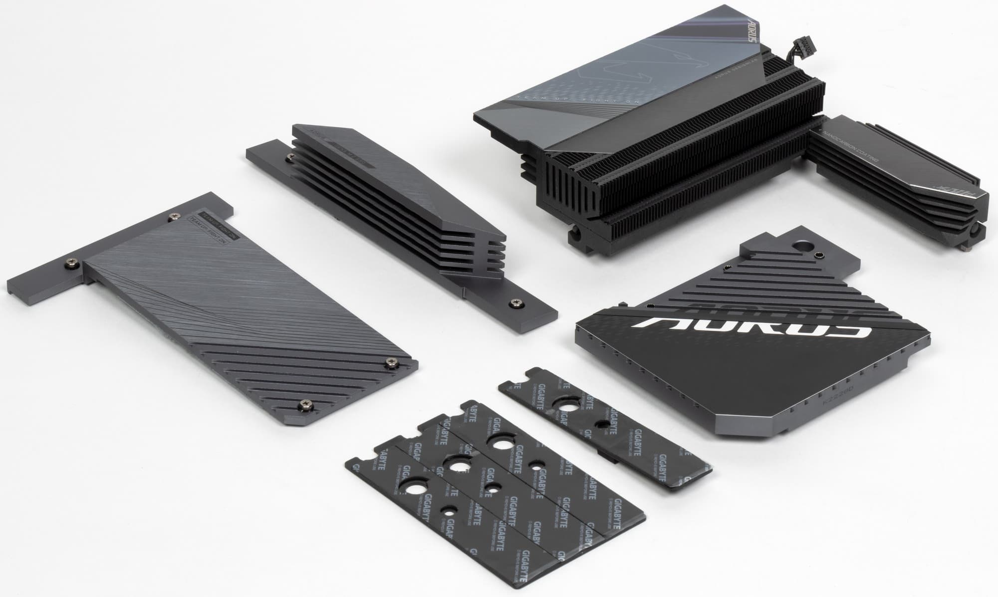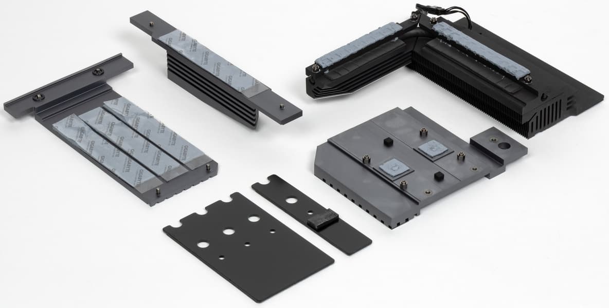 У всех модулей M.2, как я уже выше отмечал, есть свои радиаторы с термоинтерфейсом. У верхнего — свой отдельный радиатор, у трех остальных — общий. Следует особо отметить, что все 4 слота M.2 оснащены термопрокладками с обеих сторон. То есть под слотами также есть плоские тонкие радиаторы.