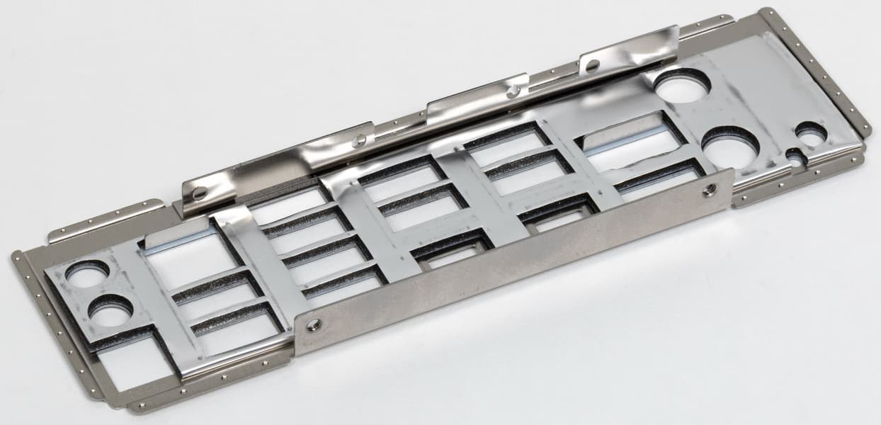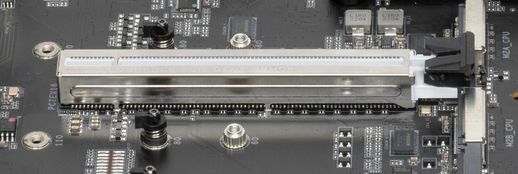 «Процессорный» слот PCIe x16 имеет металлическое армирование из нержавеющей стали, которое увеличивает их надежность (что может быть важным в случае довольно частой смены видеокарт, но что более важно: такой слот легче выдержит нагрузку на изгиб в случае установки очень тяжелой видеокарты топового уровня. Кроме того, такая защита предохраняет слоты от электромагнитных помех.