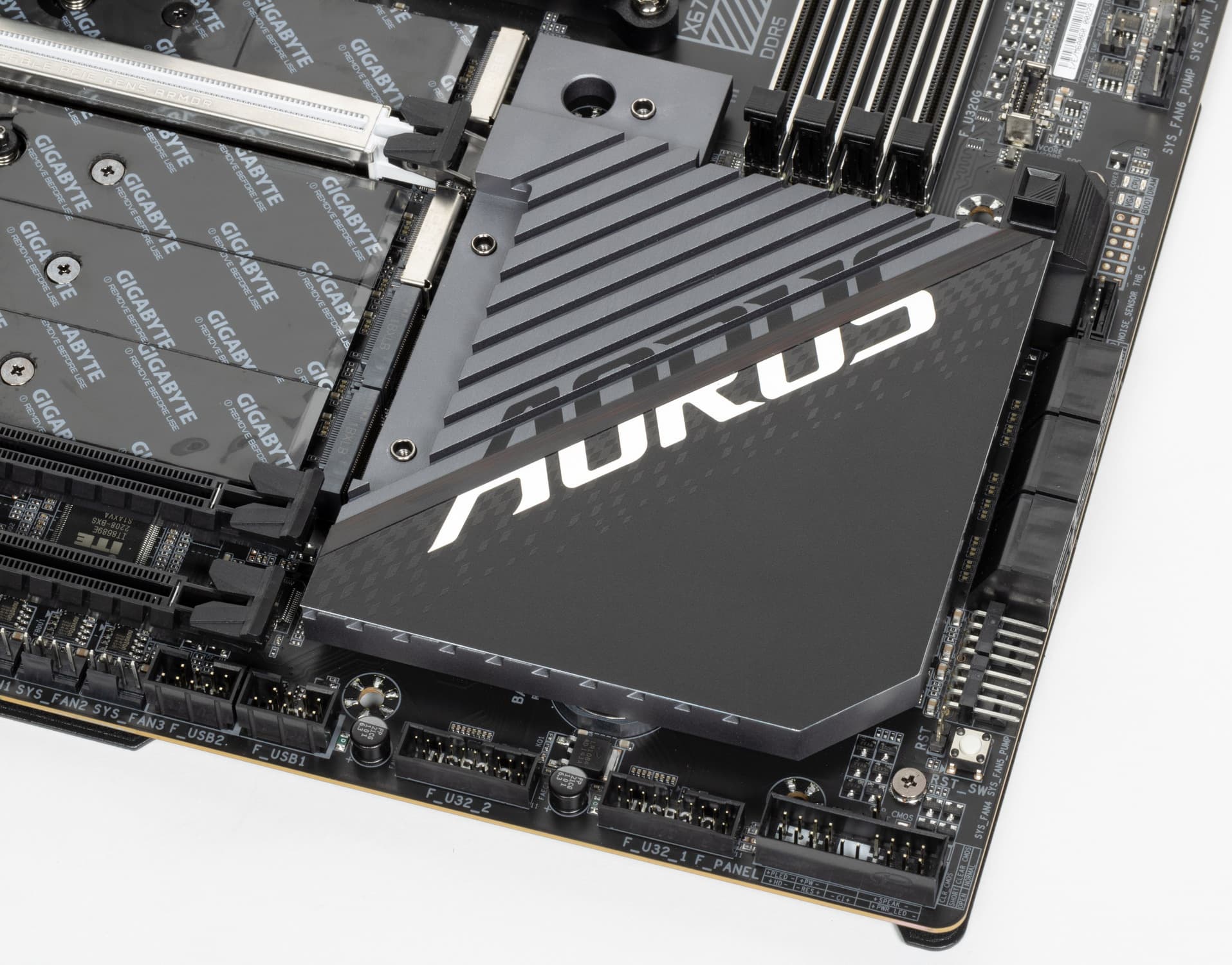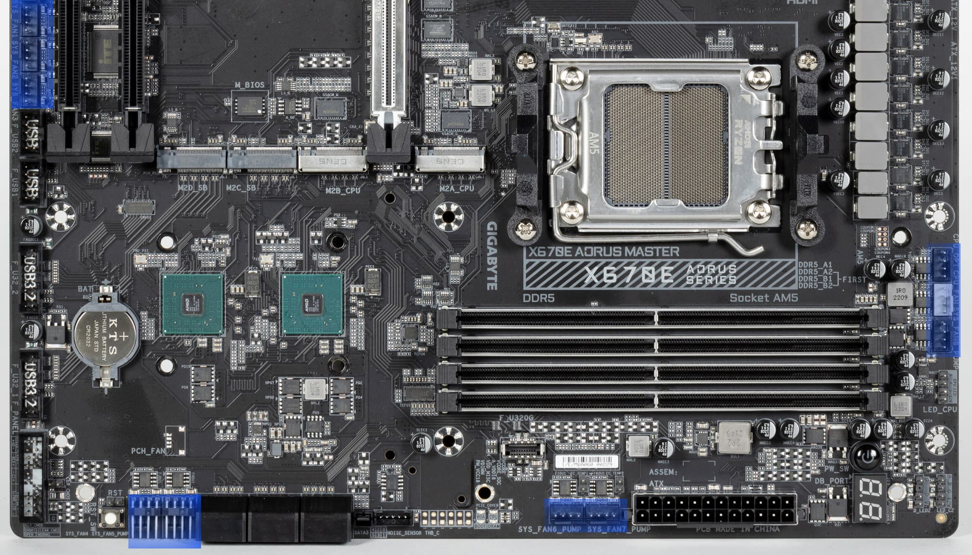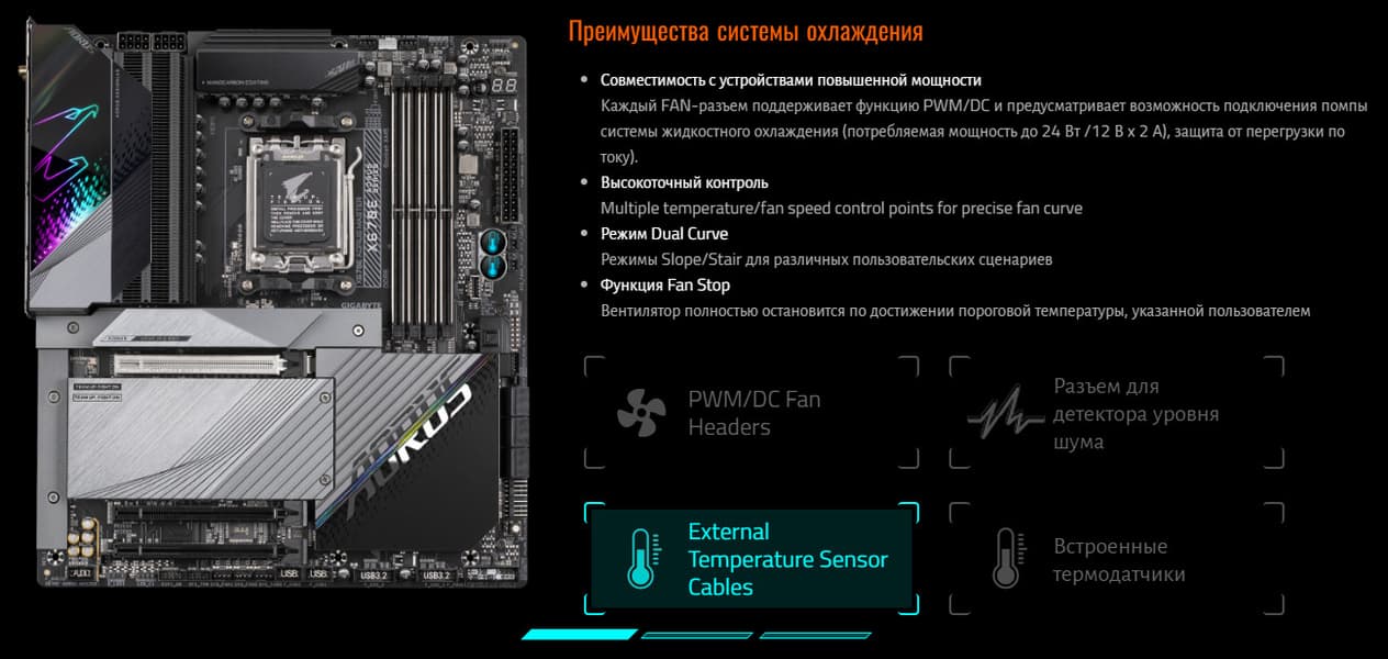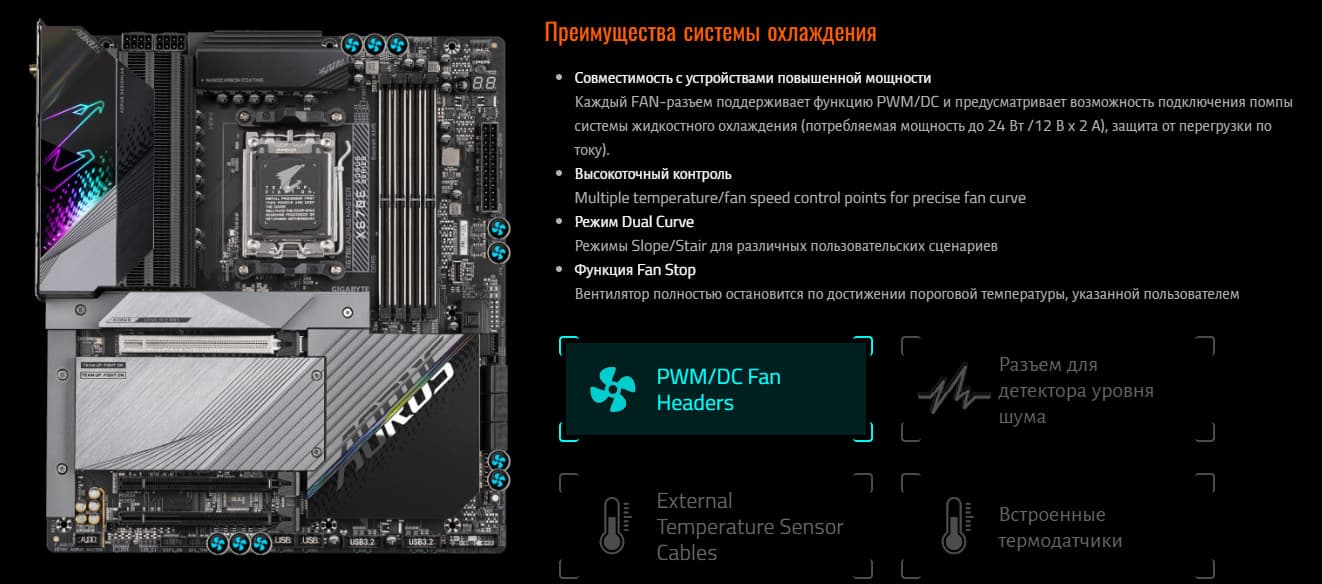 Все потенциально сильно греющиеся элементы имеют свои собственные радиаторы. Пара чипов X670E имеет весьма массивный радиатор, он прекрасно справляется с охлаждением без вентилятора.