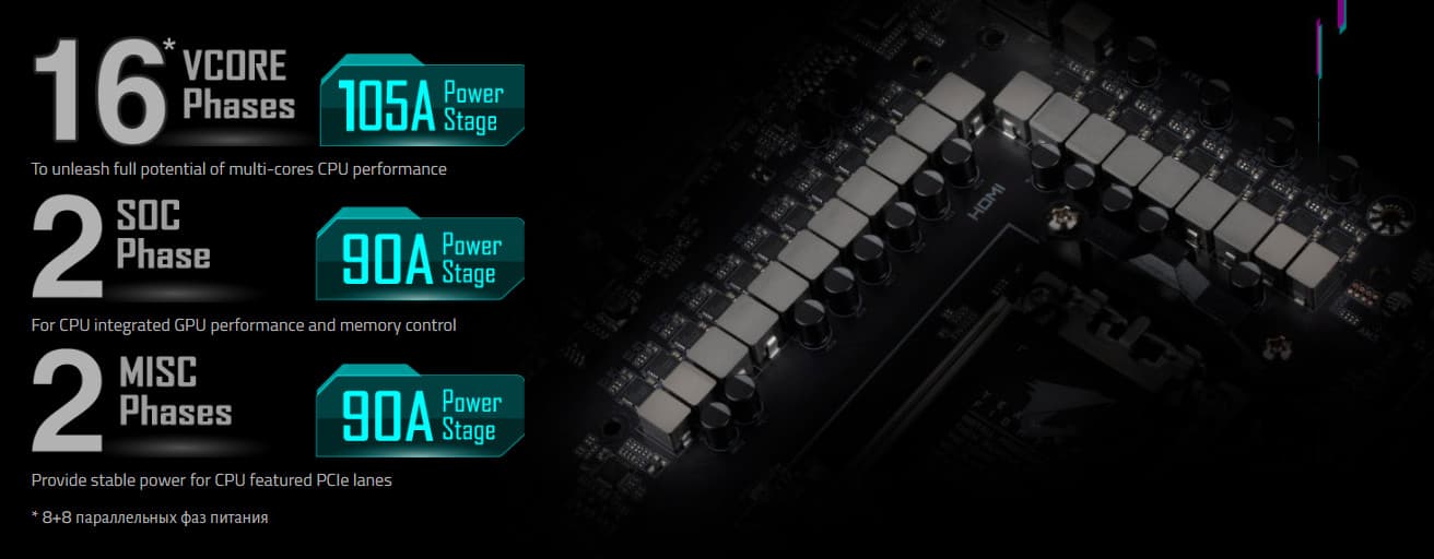 Внешне схема питания выглядит как 16+2+2: 16 фаз — ядро процессора, 2 фазы — SoC (I/O-чиплет Ryzen), 2 фазы — VDD_MISC (вывод встроенной графики).