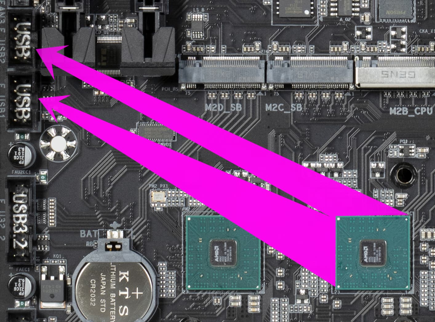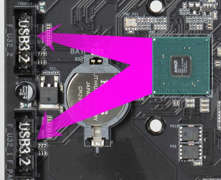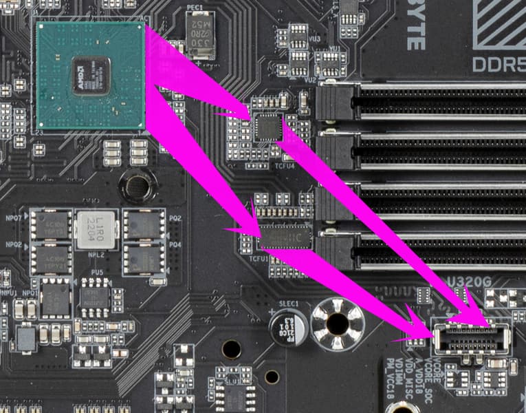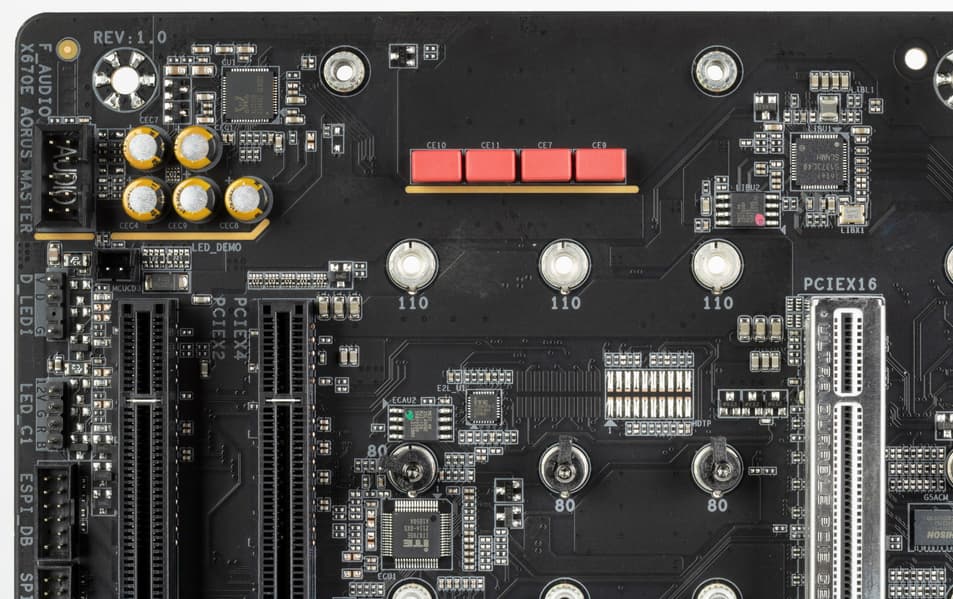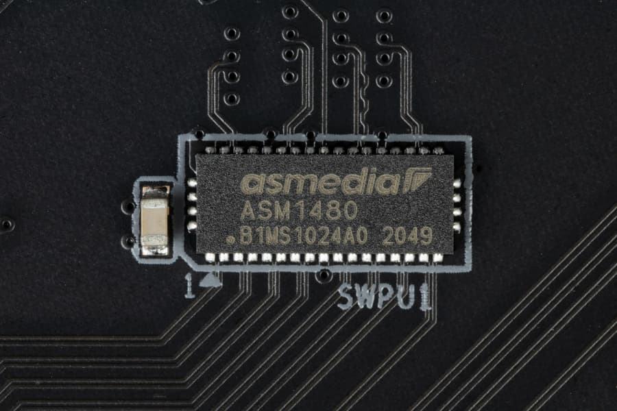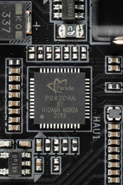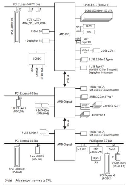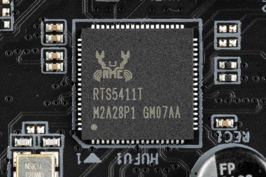 В процессорах Ryzen встроен контроллер High Definition Audio (HDA), связь с аудиокодеком идет путем эмуляции PCI шины. А также контроллер USB 2.0 Genesys Logic GL850G использует линию USB 2.0 от CPU, а Realtek RTS5411 использует 1 линию USB 3.2 Gen1 от X670E (детали ниже в разделе USB портов).