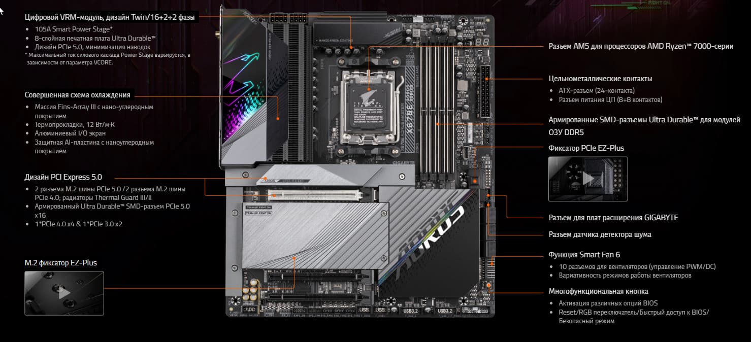 | Поддерживаемые процессоры | AMD Ryzen 7xxx под AM5 |