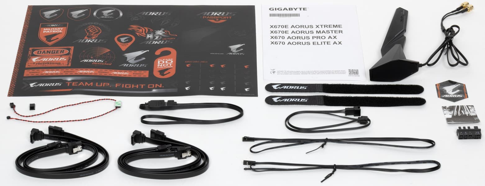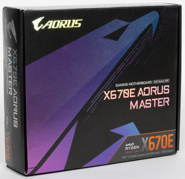 Gigabyte X670E Aorus Master поставляется в традиционной для Aorus коробке из жесткого картона с фирменным орлиным дизайном серии. Комплект размещен под платой в отдельных отсеках.